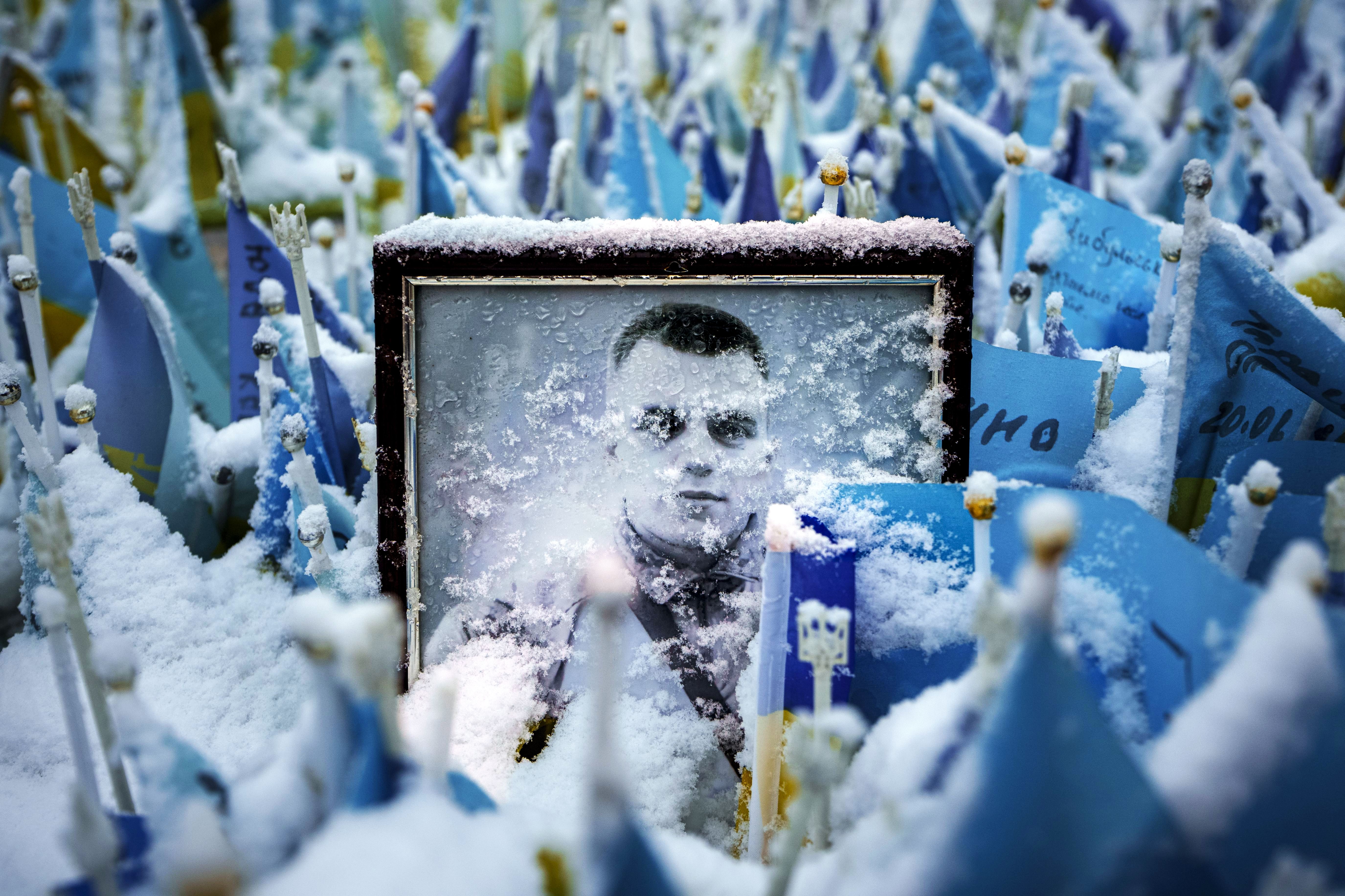 Snowflakes cover the photograph of a fallen Ukrainian serviceman downtown Kyiv, Ukraine, Tuesday, March 12, 2024. (Photo by Vadim Ghirda/AP Photo)
