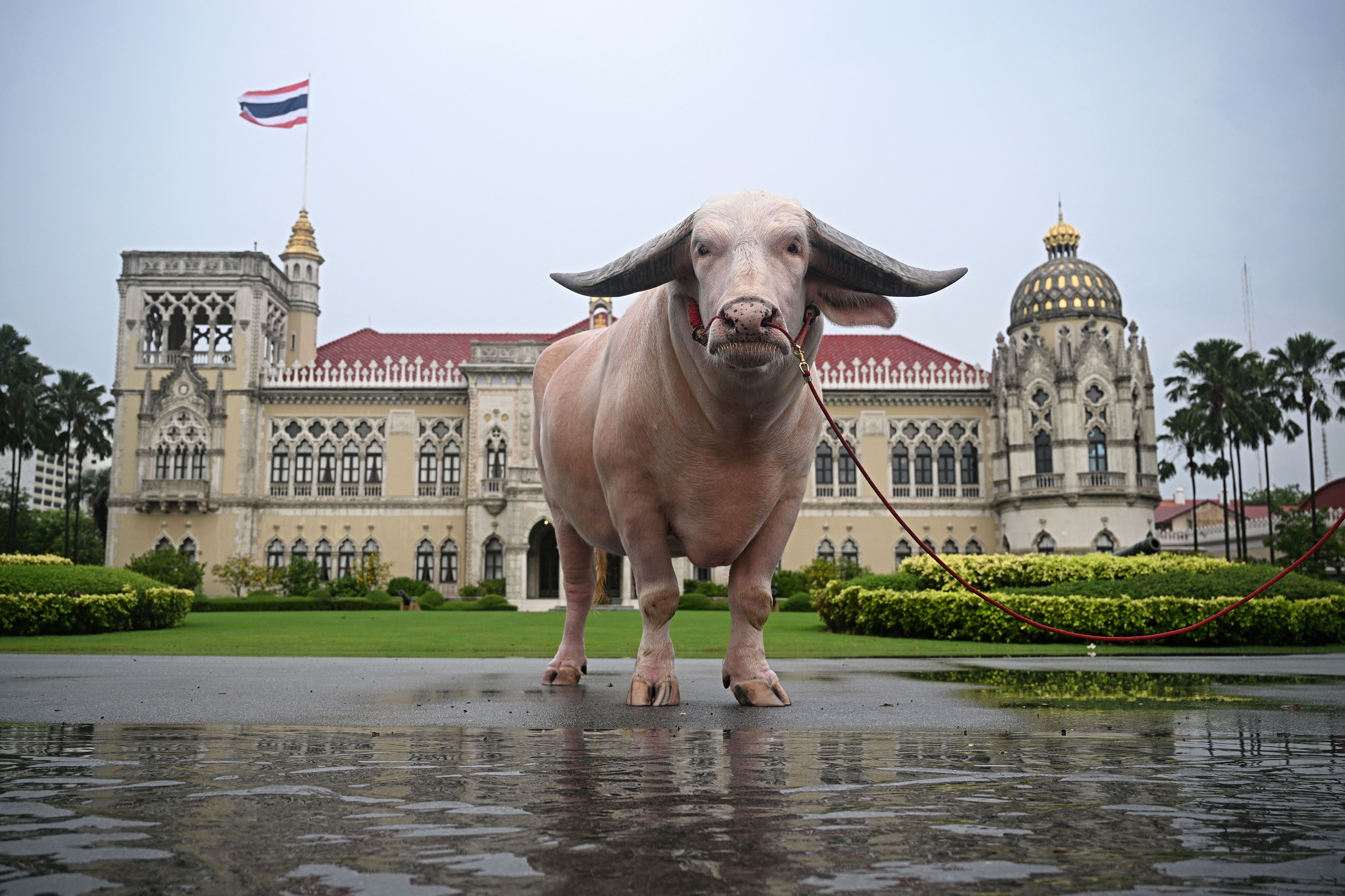 Ko Muang Phet, a white buffalo who was sold for 18 million baht, poses for a photo after a meeting between prime minister Srettha Thavisin and members of the Thai Buffalo Breeding Development Association at Government House in Bangkok on March 20, 2024. Thai Prime Minister Srettha Thavisin took the bull by the horns on March 20, 2024 as he welcomed an unusual visitor to his offices – an enormous white buffalo. (Photo by Lillian Suwanrumpha/AFP Photo)