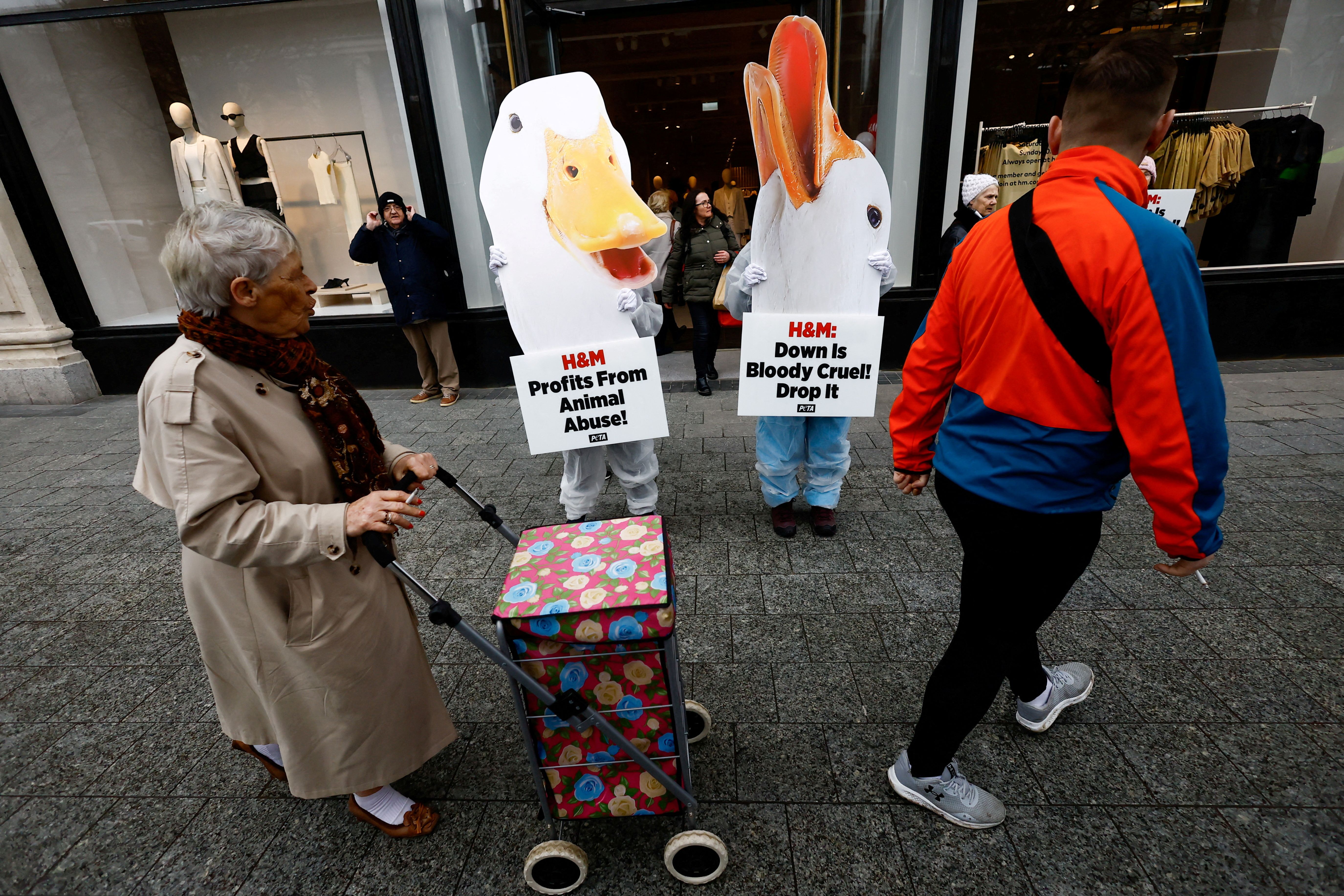 People hold up signs during an animal welfare protest outside the opening of a new H&M shop in Dublin, Ireland on March 15, 2024. (Photo by Clodagh Kilcoyne/Reuters)