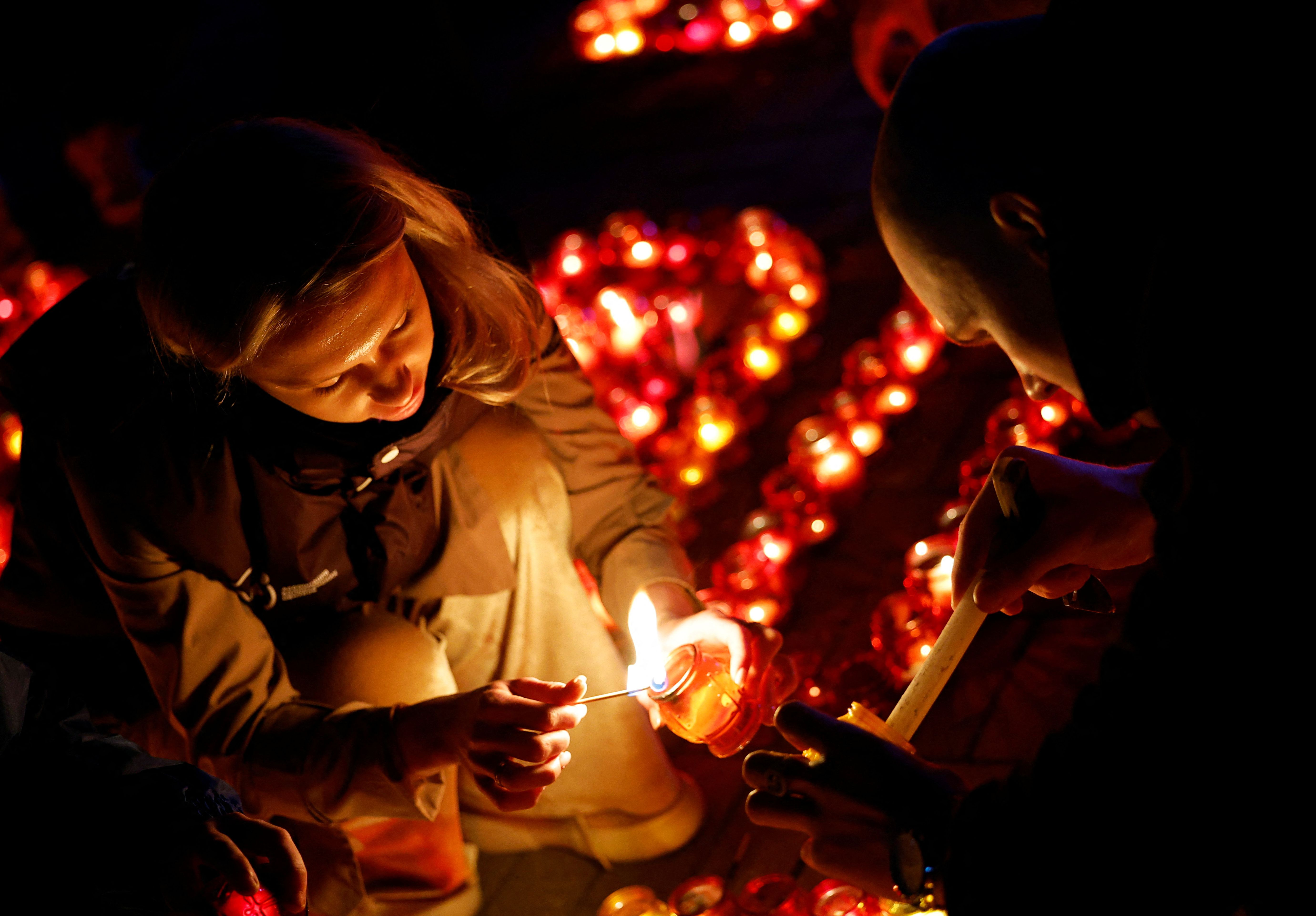 People light candles during a vigil in memory of the victims of a shooting attack at the Crocus City Hall concert venue outside Moscow, in Donetsk, Russian-controlled Ukraine, on March 24, 2024. (Photo by Alexander Ermochenko/Reuters)