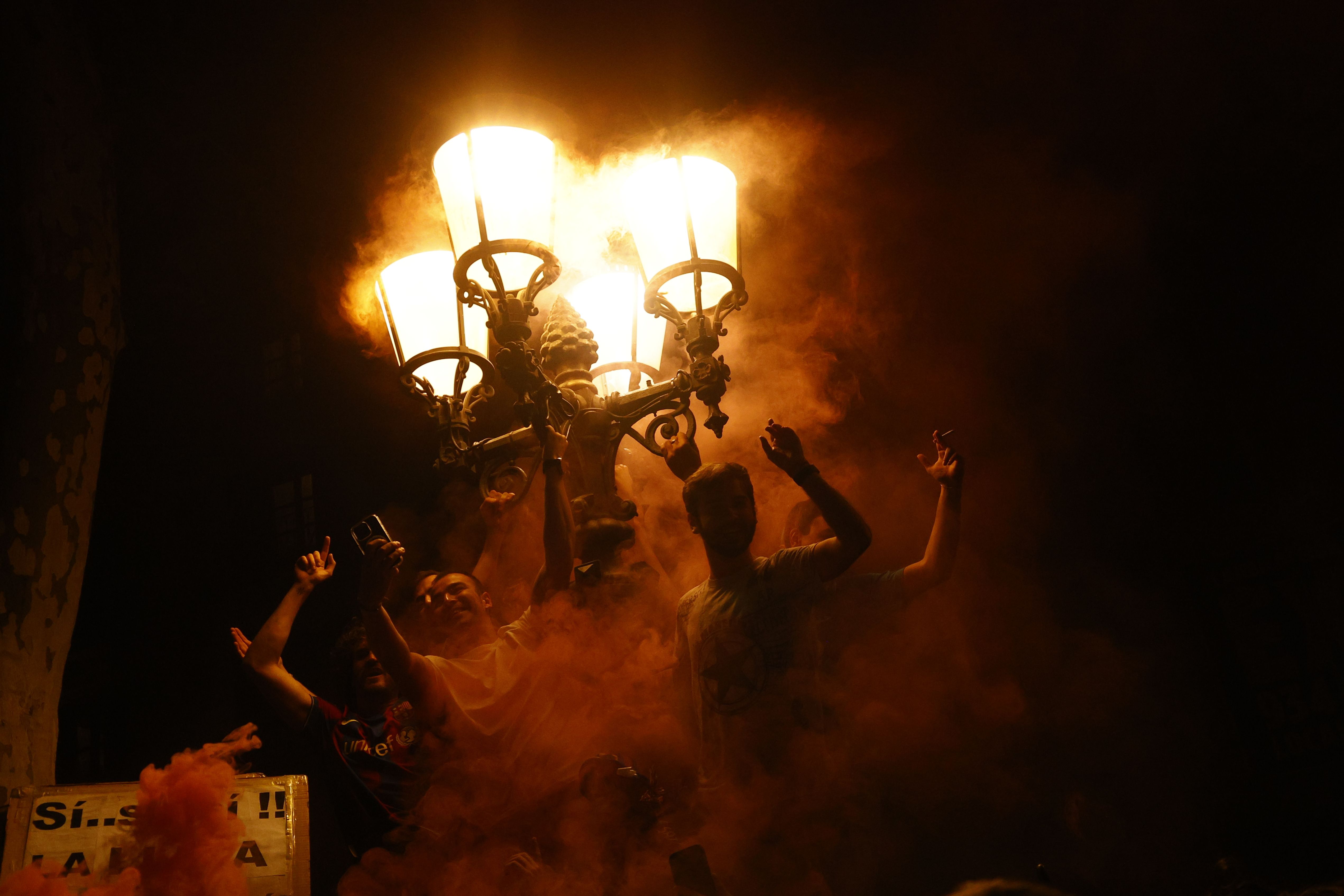 FC Barcelona's fans celebrate winning the Spanish LaLiga soccer championship at Canaletas Square in Barcelona, Spain, 15 May 2025, after the Spanish LaLiga soccer match between RCD Espanyol and FC Barcelona at the RCDE Stadium in Cornella de Llobregat. (Photo by Quique Garcia/EPA/EFE)