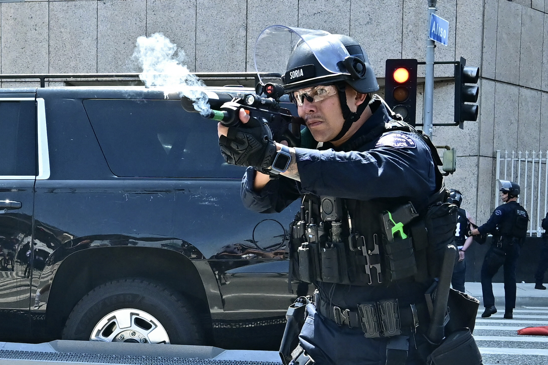 Law enforcement clashes with demonstrators outside the Metropolitan Detention Center, MDC, in downtown Los Angeles, California on June 8, 2025. US President Donald Trump deployed 2,000 troops on June 7 to handle escalating protests against immigration enforcement raids in the Los Angeles area, a move the state's governor termed “purposefully inflammatory”. Federal agents clashed with angry crowds in a Los Angeles suburb as protests stretched into a second night Saturday, shooting flash-bang grenades and shutting part of a freeway amid raids on undocumented migrants, reports said. (Photo by Frederic J. Brown/AFP Photo)