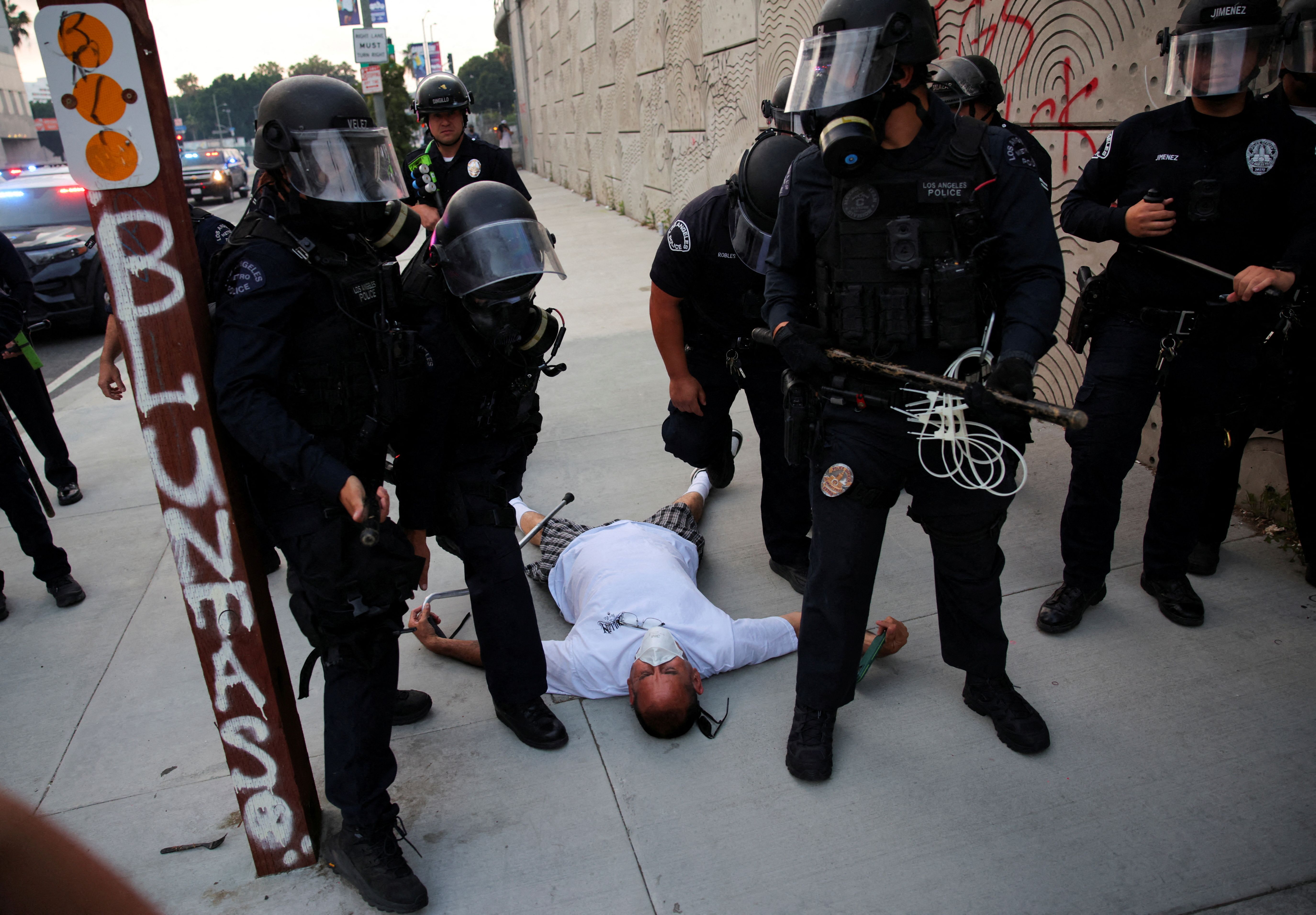 A demonstrator falls while getting detained by the police as protesters gather around the Los Angeles Federal Building following multiple detentions by Immigration and Customs Enforcement (ICE), in downtown Los Angeles, California, U.S., June 6, 2025. (Photo by Daniel Cole/Reuters)