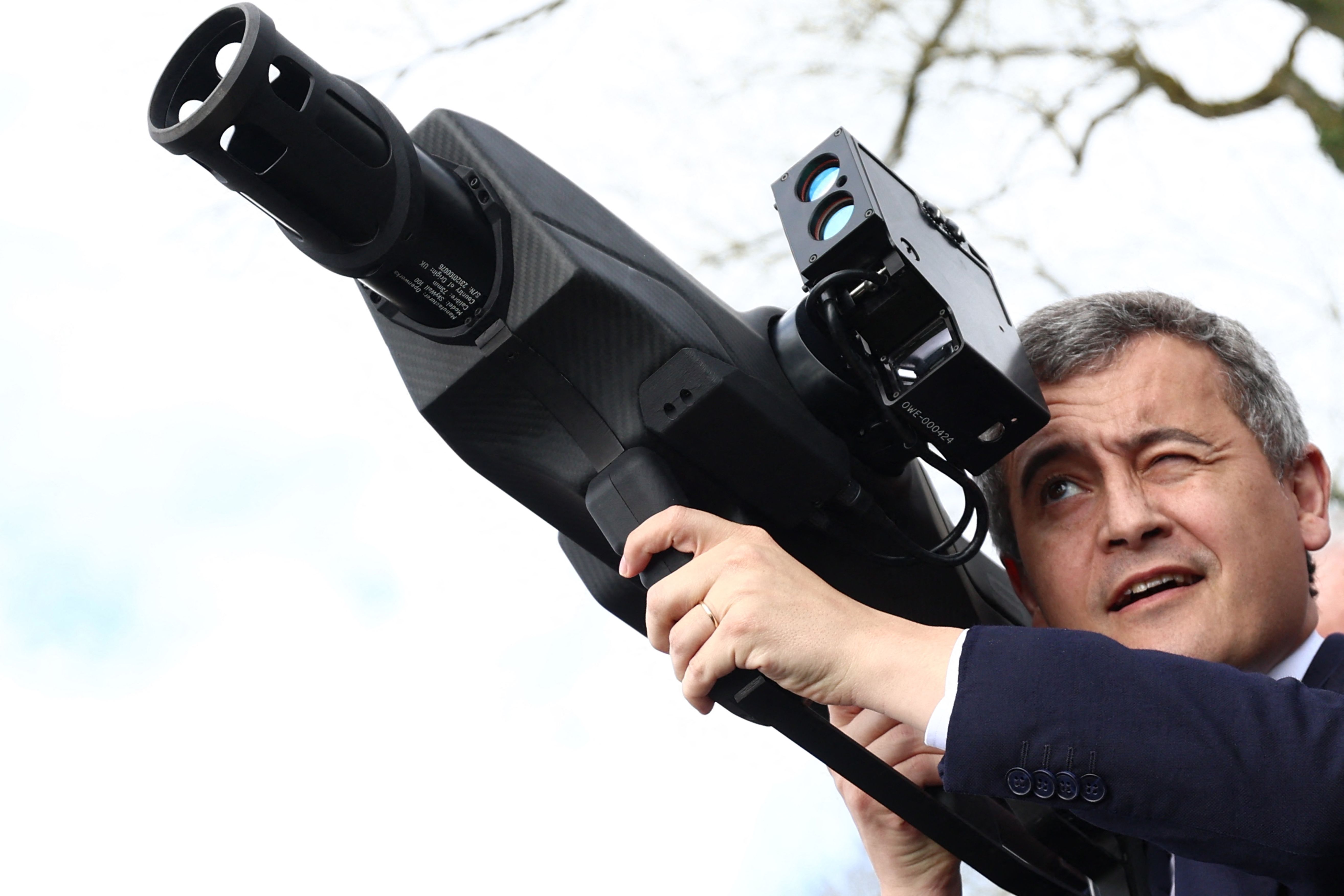 France's Minister for Interior and Overseas Gerald Darmanin holds an anti drone weapon after attending a demonstration of the security system during the Olympic flame's journey, in Beynes, west of Paris, on March 18, 2024. (Photo by Emmanuel Dunand/AFP Photo)