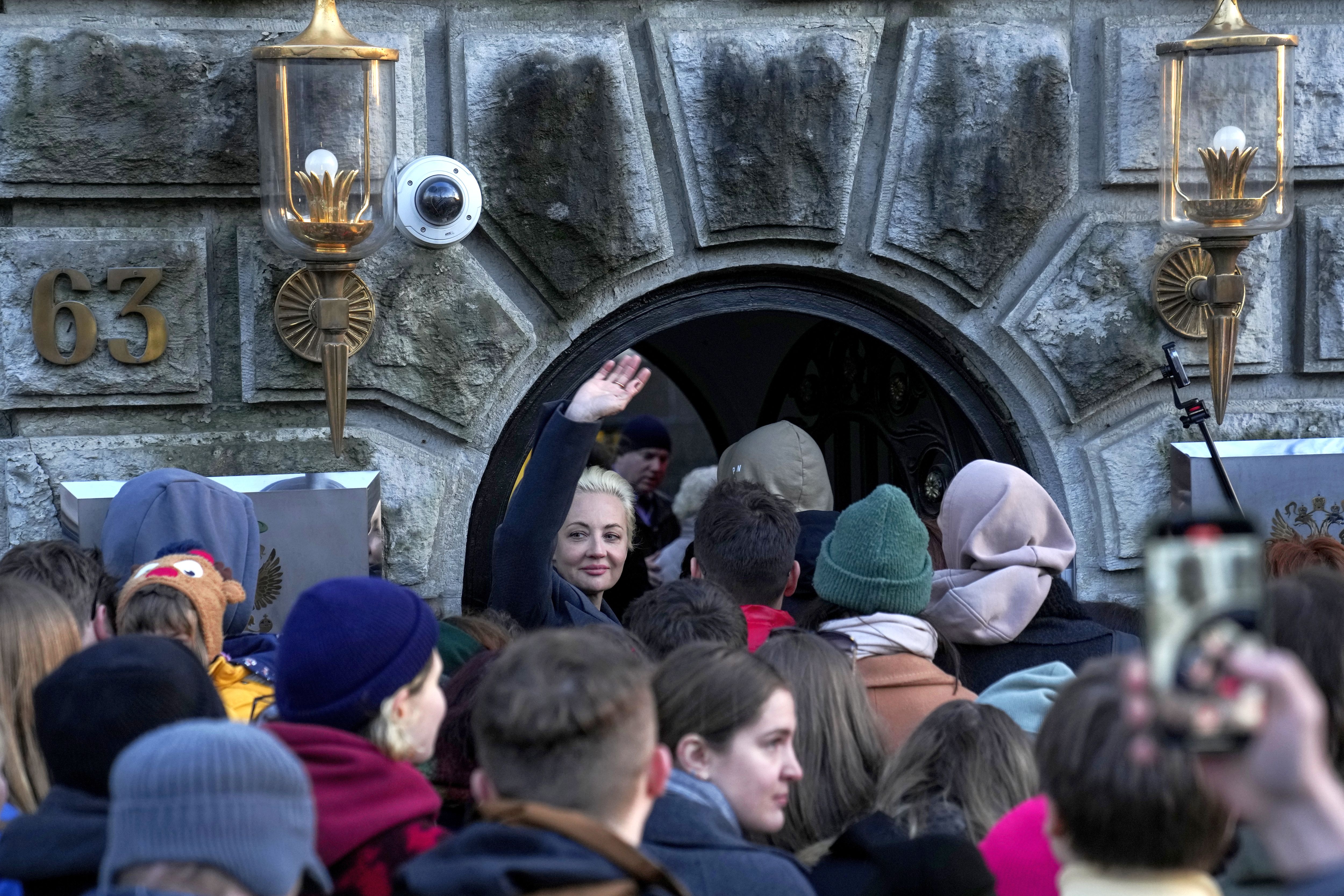 Yulia Navalnaya, centre, widow of Alexey Navalny, waves as she enters the Russian Embassy with other voters at a polling station in the Russian embassy in Berlin, after noon local time, on Sunday, March 17, 2024. The Russian opposition has called on people to head to polling stations at noon on Sunday in protest as voting takes place on the last day of a presidential election that is all but certain to extend President Vladimir Putin's rule after he clamped down on dissent. AP can't confirm that all the voters seen at the polling station at noon were taking part in the opposition protest. (Photo by Ebrahim Noroozi/AP Photo)