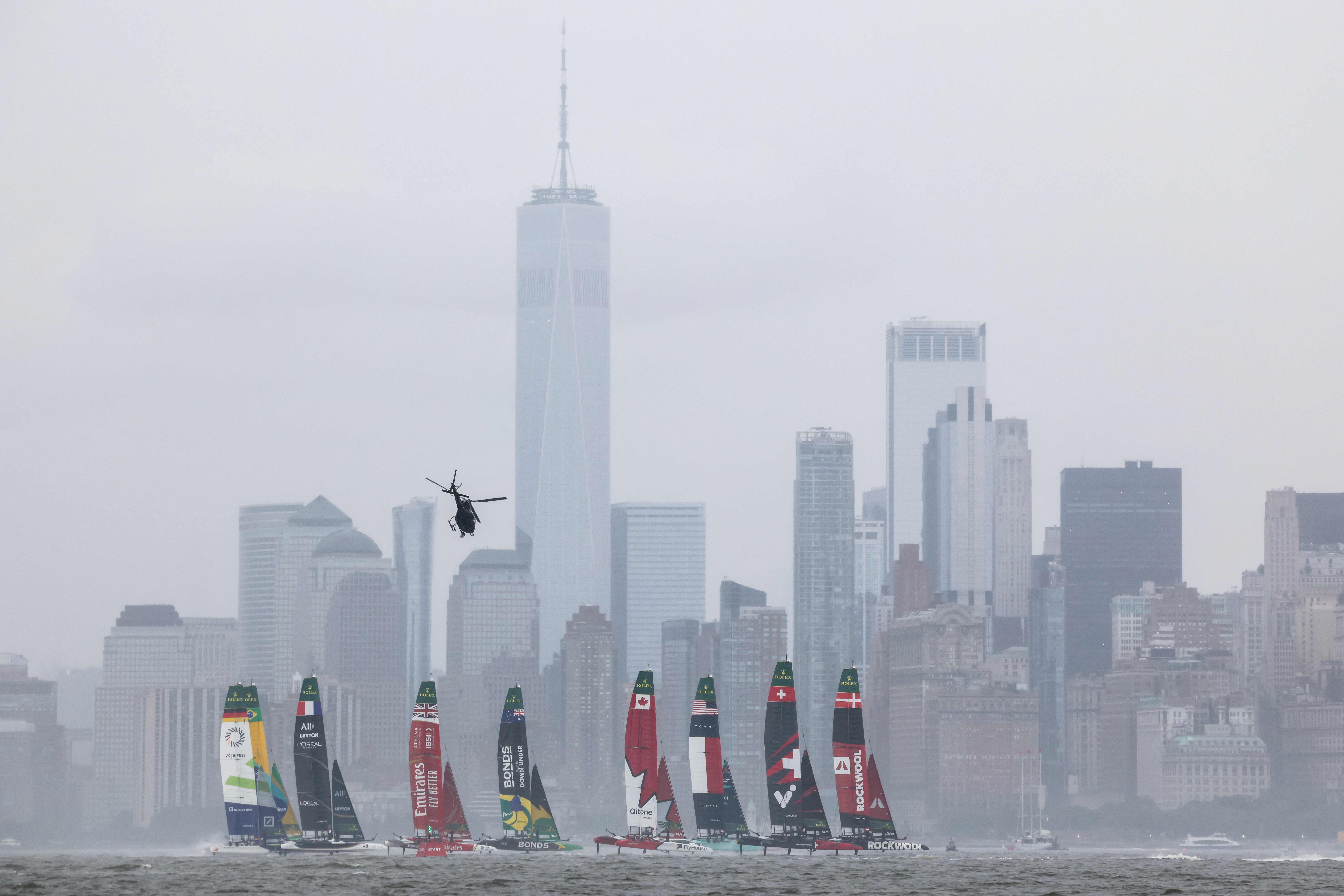 (L-R) German, Brazilian, French, British, Australian, Canadian, United States, Swiss and Danish SailGP teams compete during the Mubadala New York Sail Grand Prix in New York Harbor on June 7, 2025. (Photo by Charly Triballeau/AFP Photo)