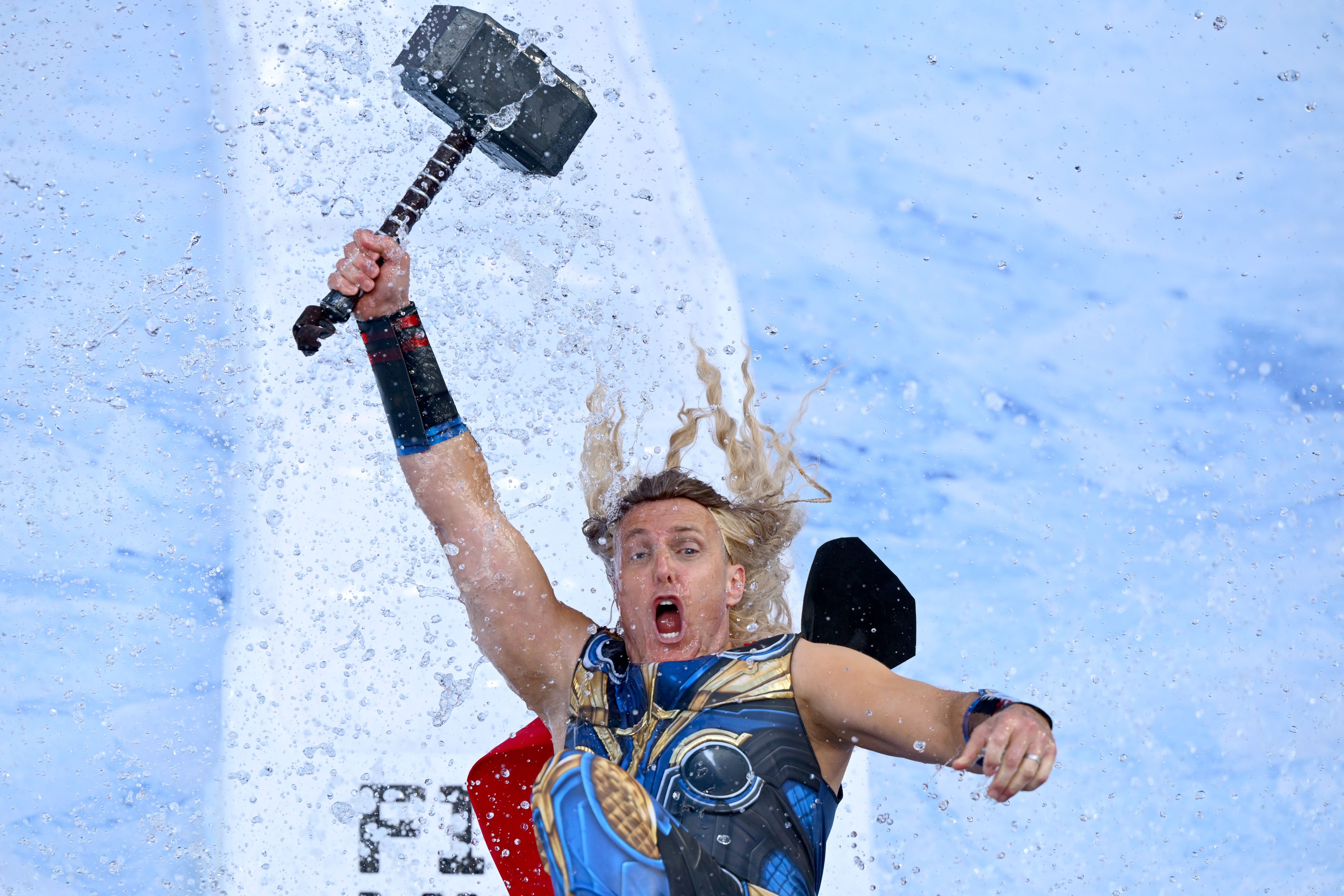 Former Australian sprinter and television presenter Matt Shirvington goes down the slide for FightMND Big Freeze 11 ahead of the round 13 AFL match between Melbourne Demons and Collingwood Magpies at Melbourne Cricket Ground, on June 09, 2025, in Melbourne, Australia. (Photo by Quinn Rooney/Getty Images)