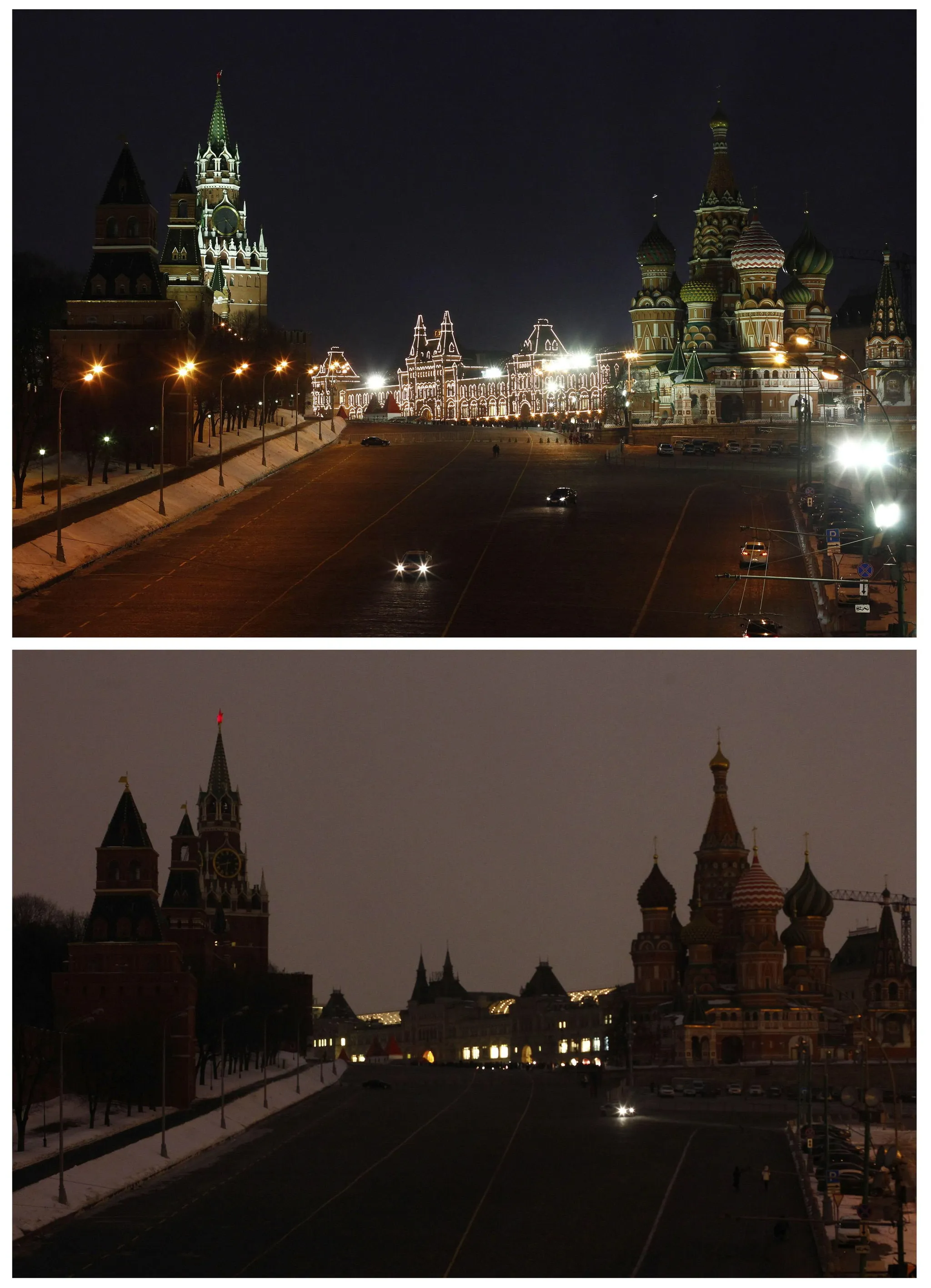 A combination photo shows a view of St. Basil's Cathedral, Red Square and the Kremlin before (top) and during Earth Hour in Moscow March 23, 2013. Earth Hour, when everyone around the world is asked to turn off the lights for an hour from 8.30pm local time, is meant as a show of support for tougher actions to combat climate change. (Photo by Mikhail Voskresensky/Reuters)
