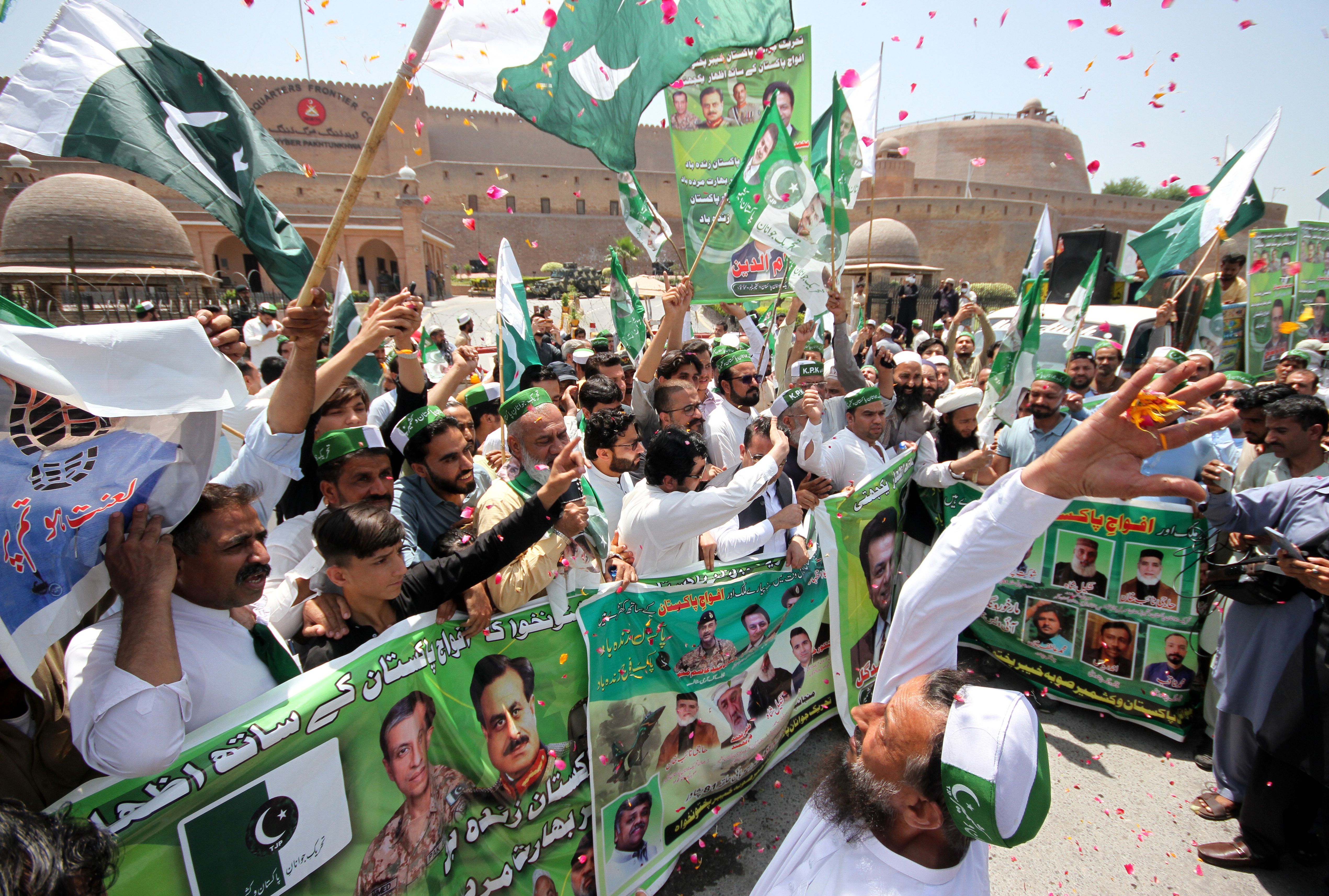 People hold national flags as they take part in a demonstration in front of the paramilitary FC headquarters to show their support for the Pakistan Army, a day after the ceasefire agreement between India and Pakistan was announced, in Peshawar, Pakistan, 11 May 2025. Pakistan and India have confirmed an immediate ceasefire, following days of military escalation between the two countries. The ceasefire, announced by US President Donald Trump and confirmed by both countries' officials, aims to halt military operations and focus on diplomatic solutions. (Photo by Arshad Arbab/EPA/EFE)