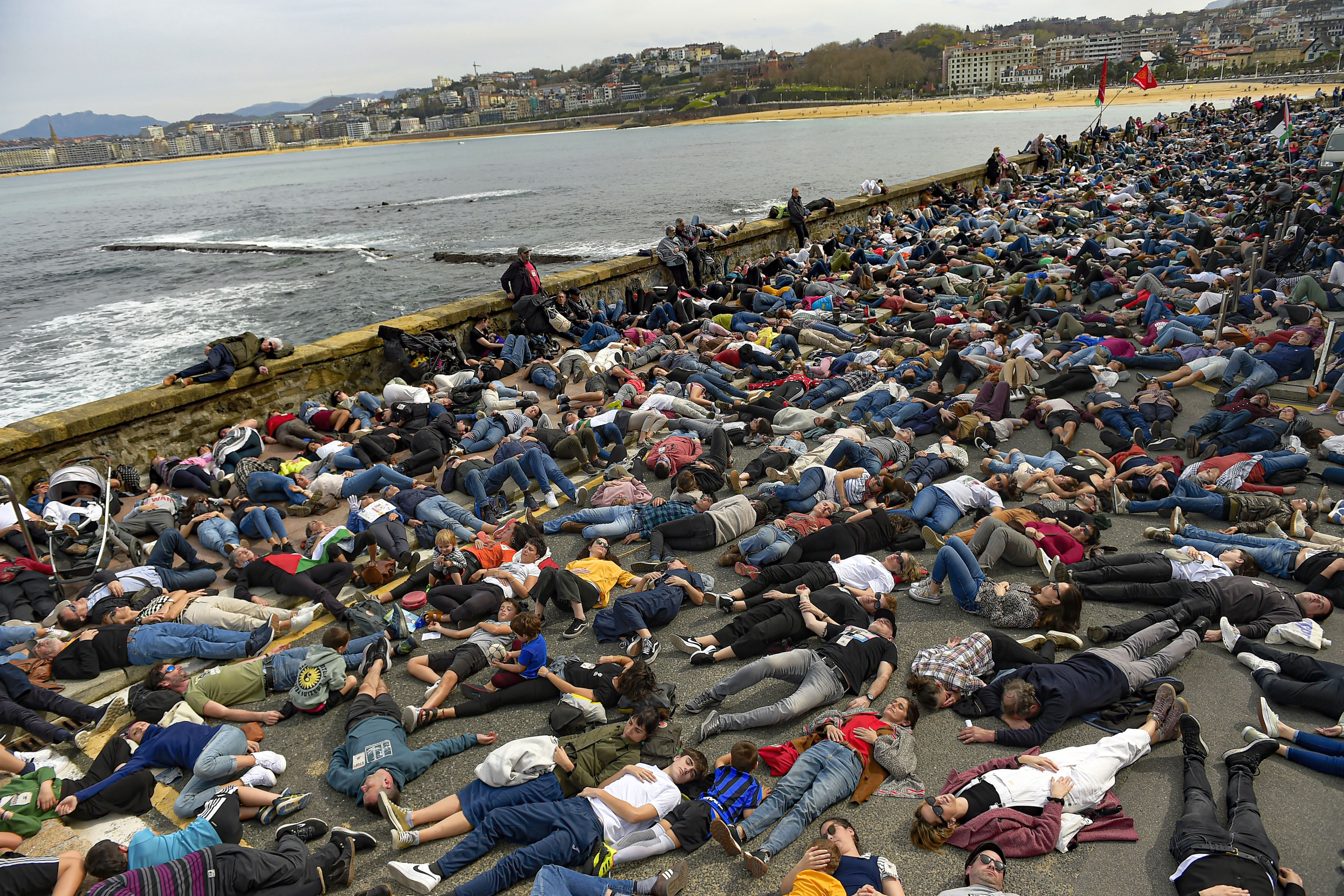 Demonstrators lie on the ground to protest against Israeli attacks on Gaza, in San Sebastian, northern Spain, on Sunday, March 17, 2024. (Photo by Alvaro Barrientos/AP Photo)