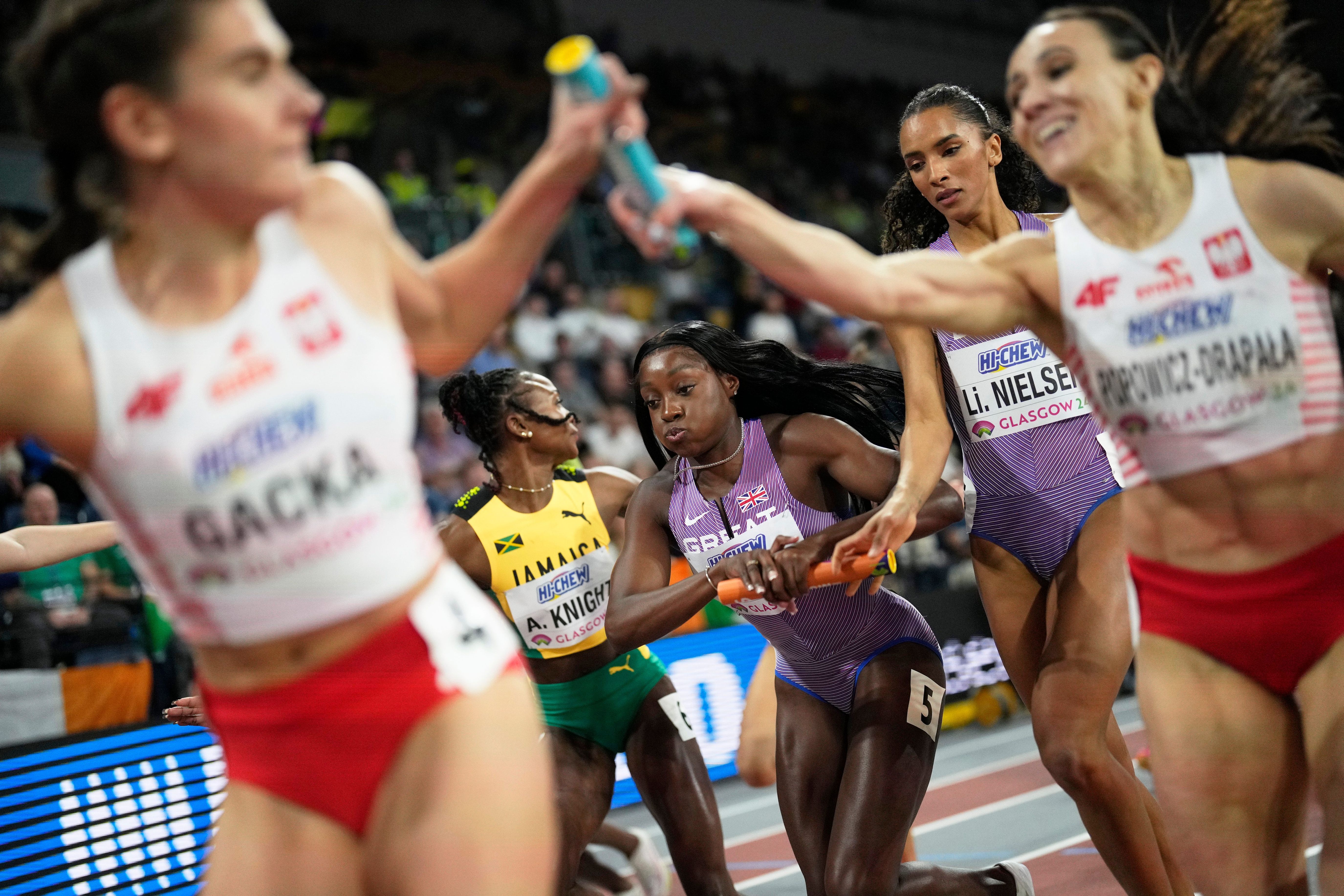 Ama Pipe, from Britain, center, receives the baton from teammate Lina Nielsen in a women's 4 X 400 meters relay heat during the World Athletics Indoor Championships at the Emirates Arena in Glasgow, Scotland, Sunday, March 3, 2024. (Photo by Bernat Armangue/AP Photo)