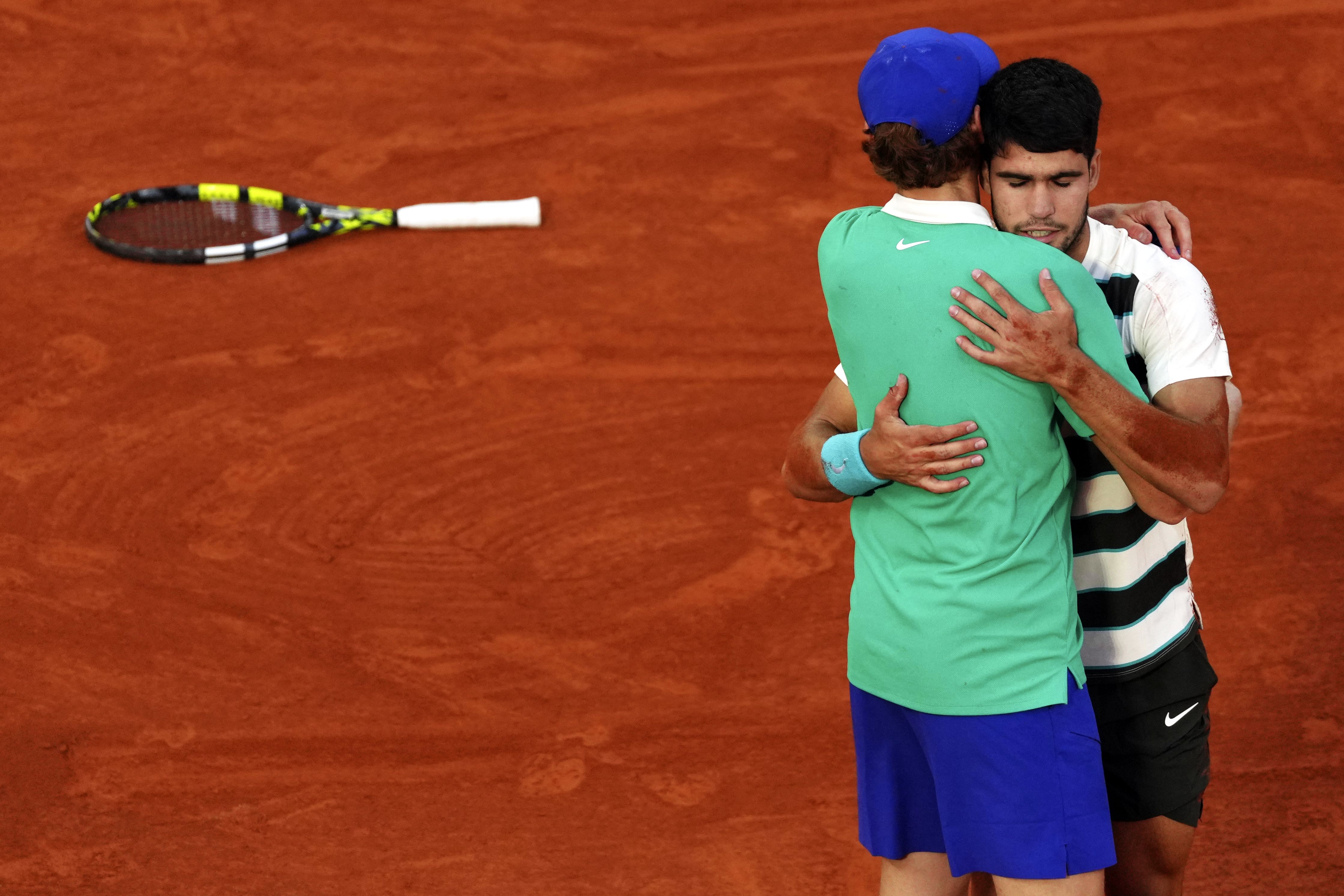 Spain's Carlos Alcaraz hugs Italy's Jannik Sinner after winning the final match of the French Tennis Open at the Roland-Garros in Paris, Sunday, June 8, 2025. (Photo by Aurelien Morissard/AP Photo)