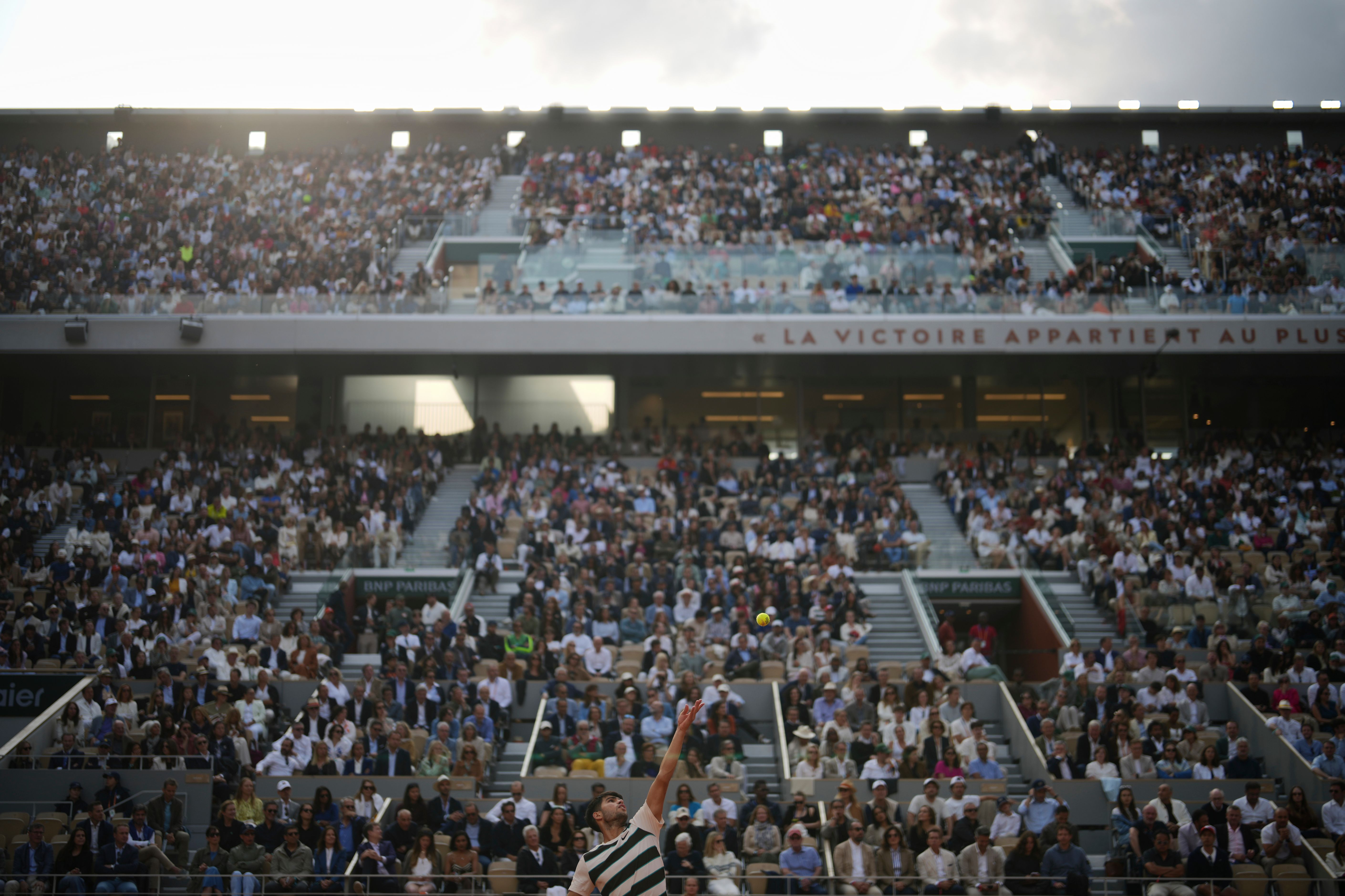 Spain’s Carlos Alcaraz serves against the world No 1, Jannik Sinner, during their over French Open final that lasted five hours and 29 minutes at the Roland-Garros stadium in Paris, Sunday, June 8, 2025. Alcaraz pulled off one of the greatest comebacks in the history of the sport, spectacularly toppling Sinner 4-6, 6-7 (4), 6-4, 7-6 (3), 7-6 (2). (Photo by Thibault Camus/AP Photo)