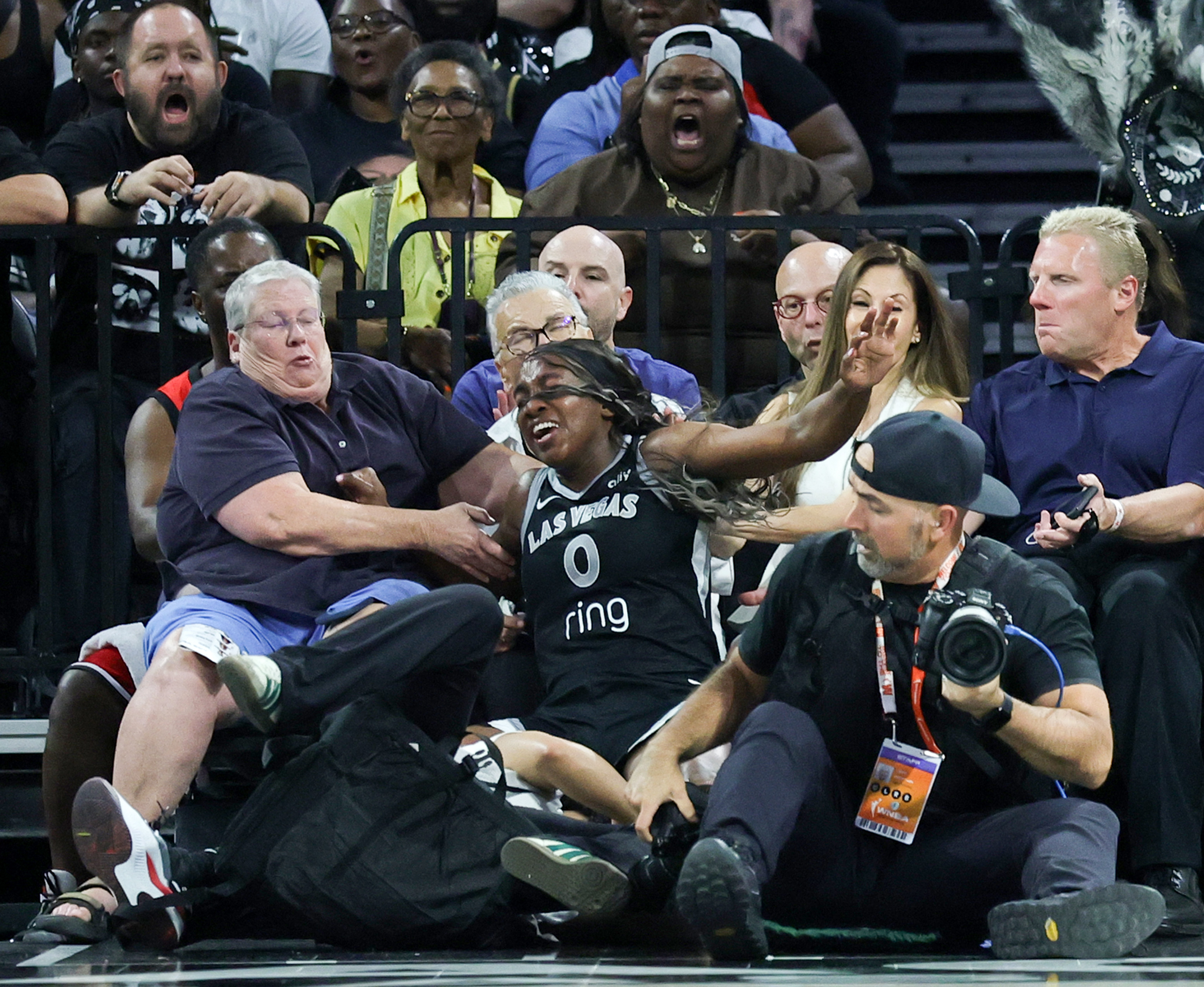 Jackie Young #0 of the Las Vegas Aces falls out of bounds after scoring a basket and drawing a foul against Mercedes Russell #21 of the Los Angeles Sparks in the third quarter of their game at Michelob ULTRA Arena on June 11, 2025 in Las Vegas, Nevada. The Sparks defeated the Aces 97-89. (Photo by Ethan Miller/Getty Images)