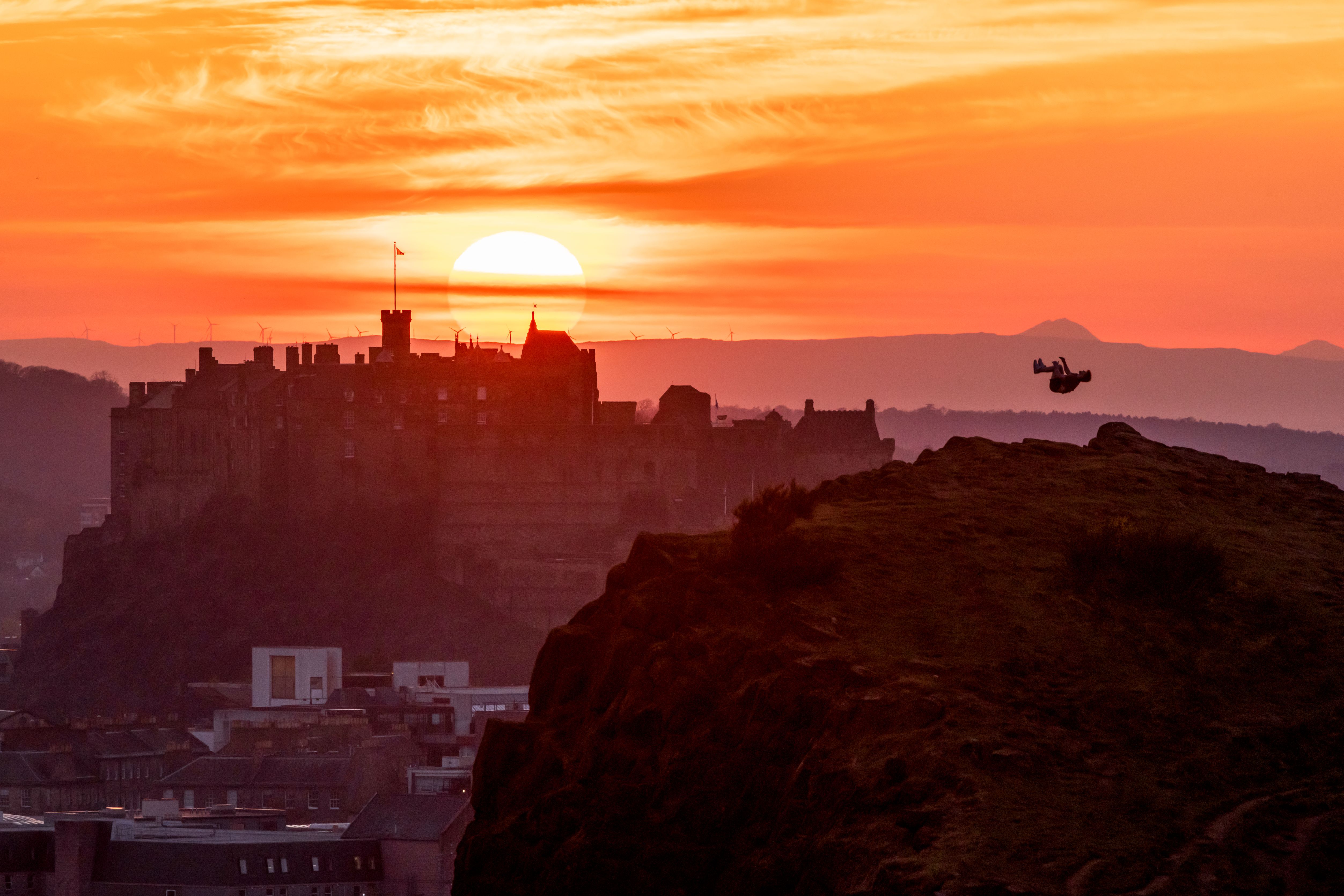 A man observes the sunset on April 10, 2025 over a silhouetted Edinburgh Castle as seen from the summit of Arthur's Seat, Edinburgh, Scotland. (Photo by Tom Duffin/Solent News & Photo Agency)