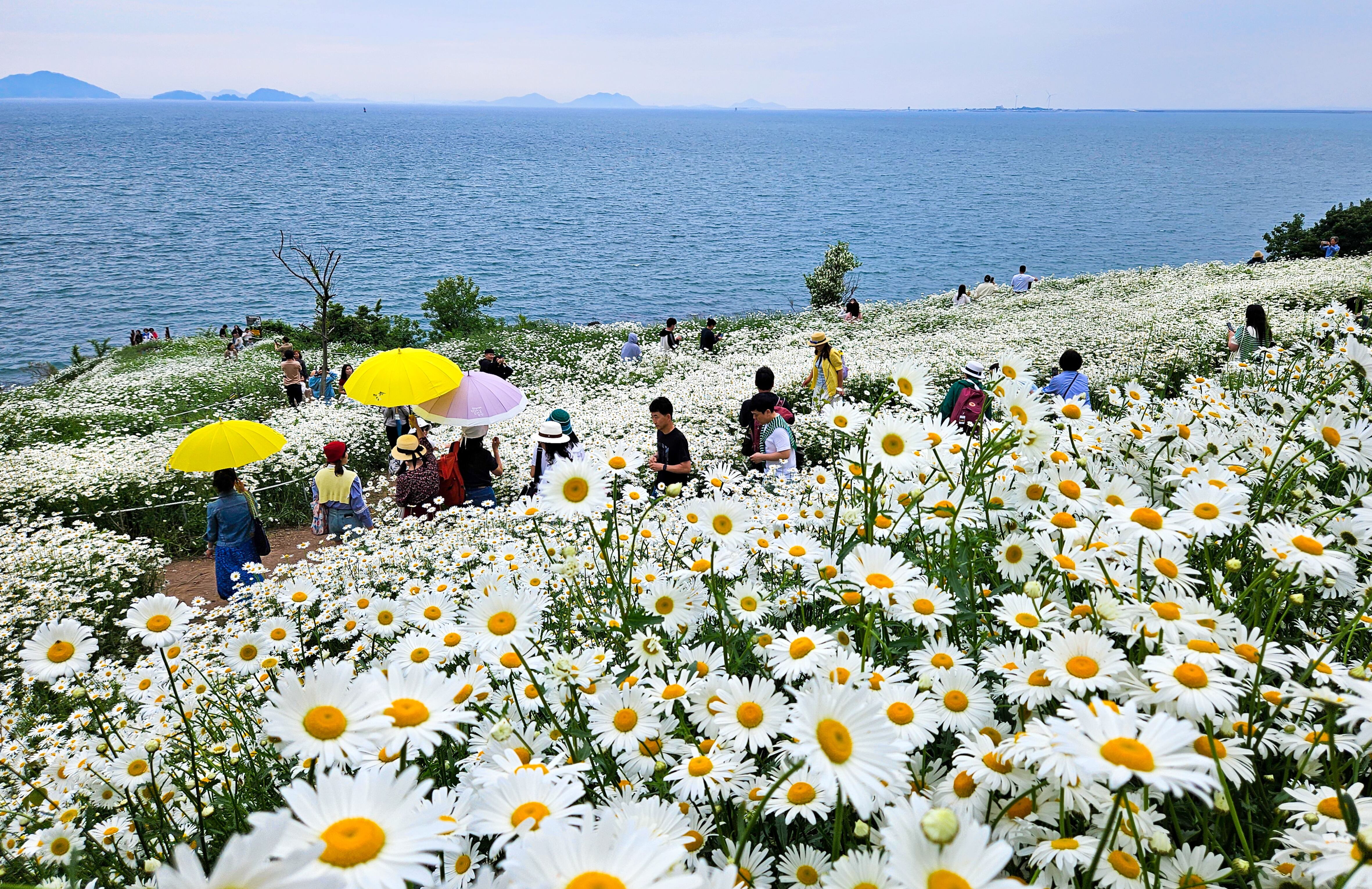 On the May 24, 2025, Shasta daisy flowers are in full bloom on a mountain in Byeonsan-myeon, Buan-gun, Jeollabuk-do, creating a spectacular sight along with the West Sea. (Photo by Kim Young-geun)