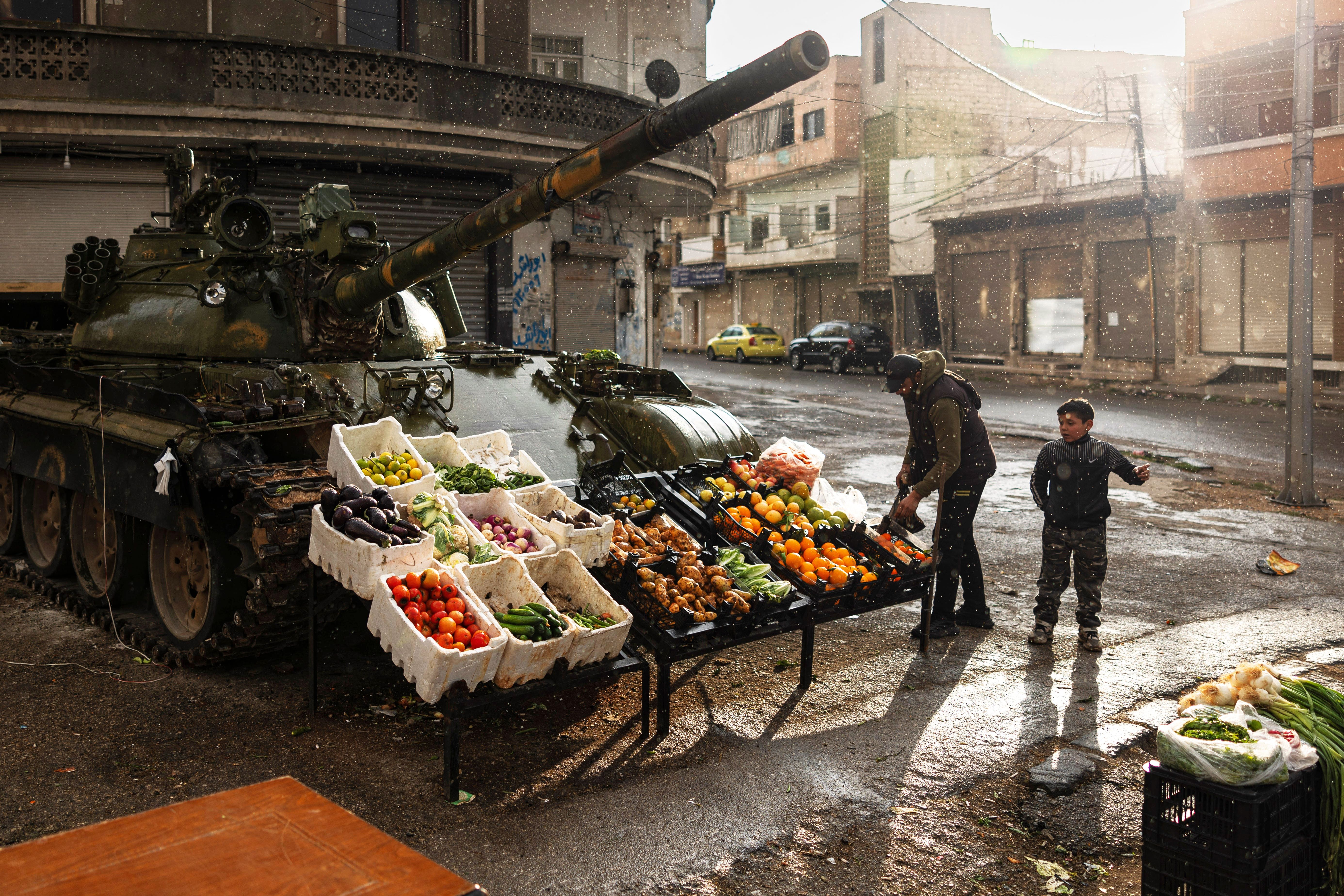 A Syrian man sells vegetables in front of a damaged tank in Homs, on December 20, 2024. Islamist-led rebels took Damascus in a lightning offensive on December 8, ousting president Bashar al-Assad and ending five decades of Baath rule in Syria. (Photo by Sameer Al-Doumy/AFP Photo)