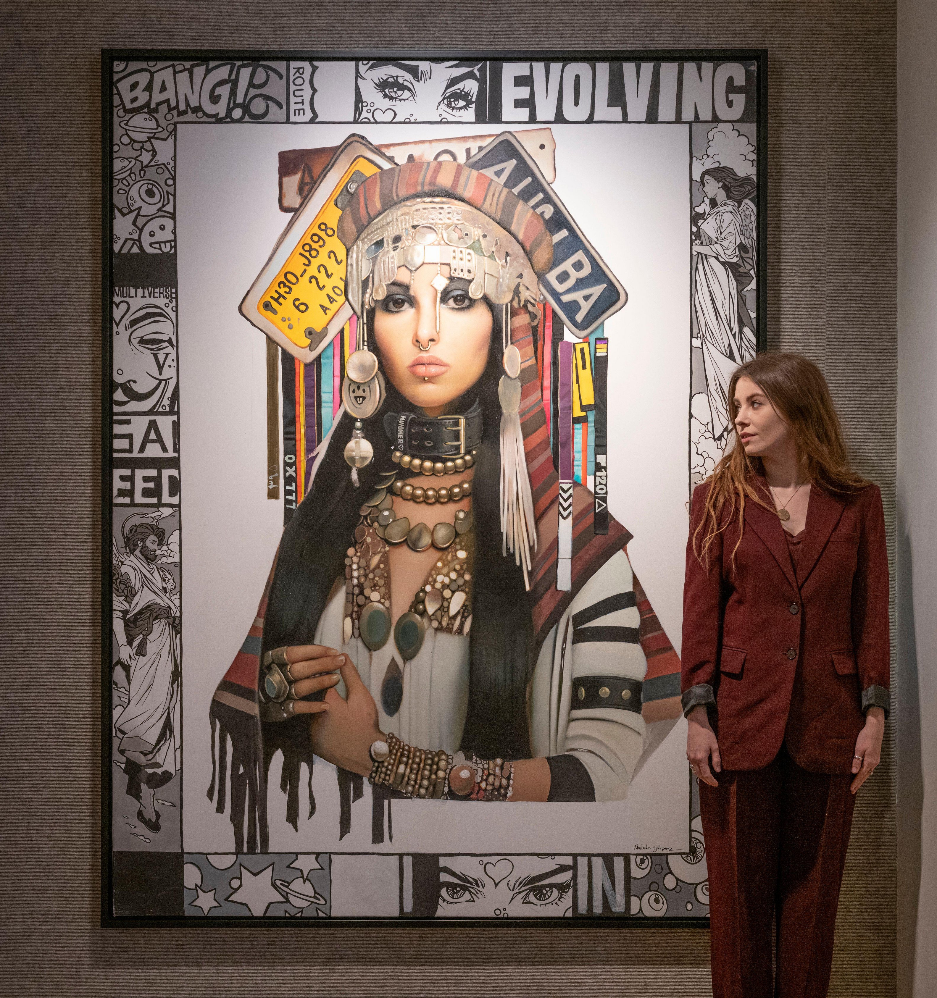 Painting of a woman wearing a headdress, surrounded by comic-style imagery, at an art sale in London on May 20, 2025. The Modern and Contemporary Middle Eastern Art sale takes place on 21 May. (Photo by Malcolm Park/Alamy Live News)