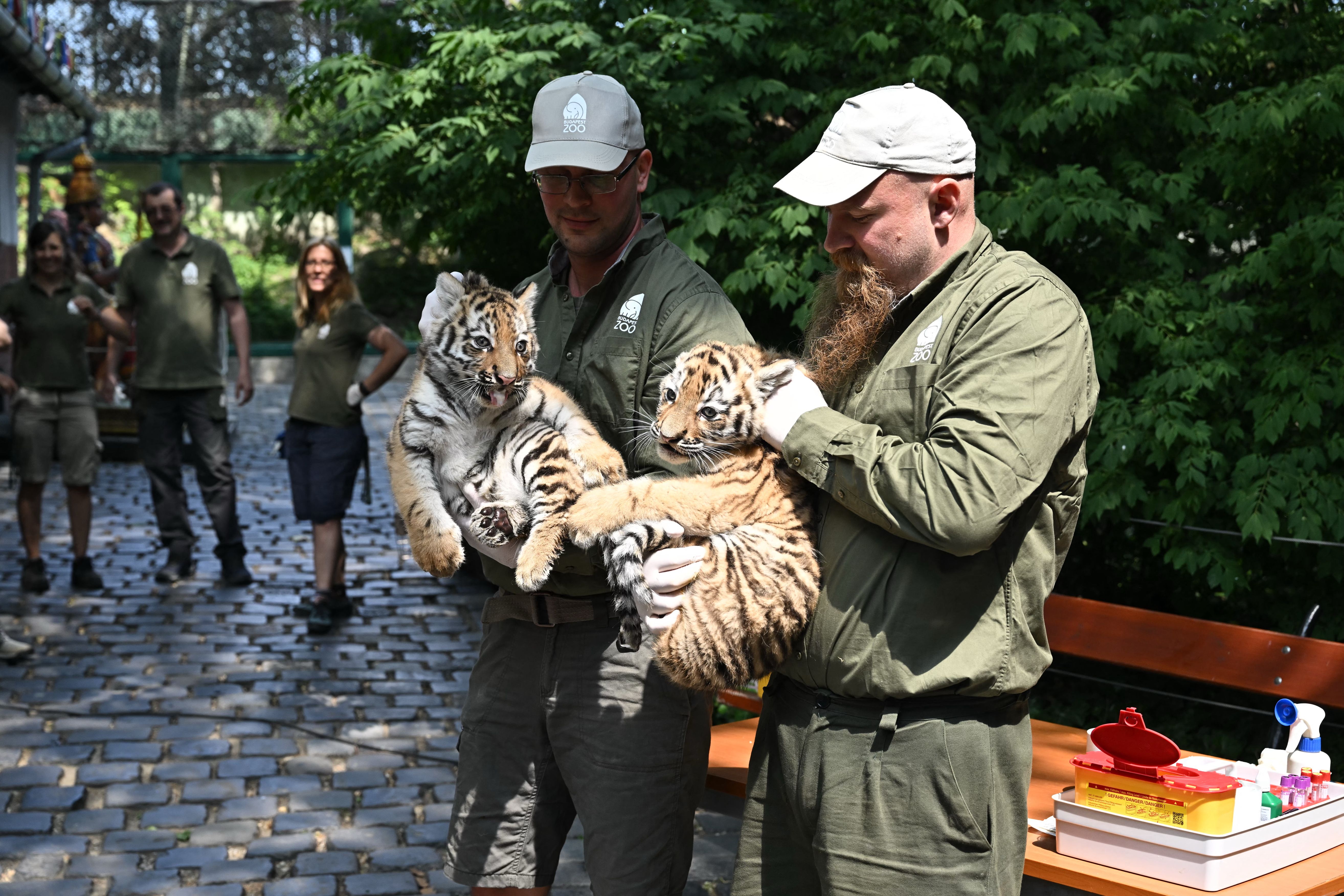 Siberian tiger twins, born on April 13, 2025, are presented to the press at the Budapest zoo and botanic garden, on June 12, 2025 during their first veterinary examination. (Photo by Attila Kisbenedek/AFP Photo)