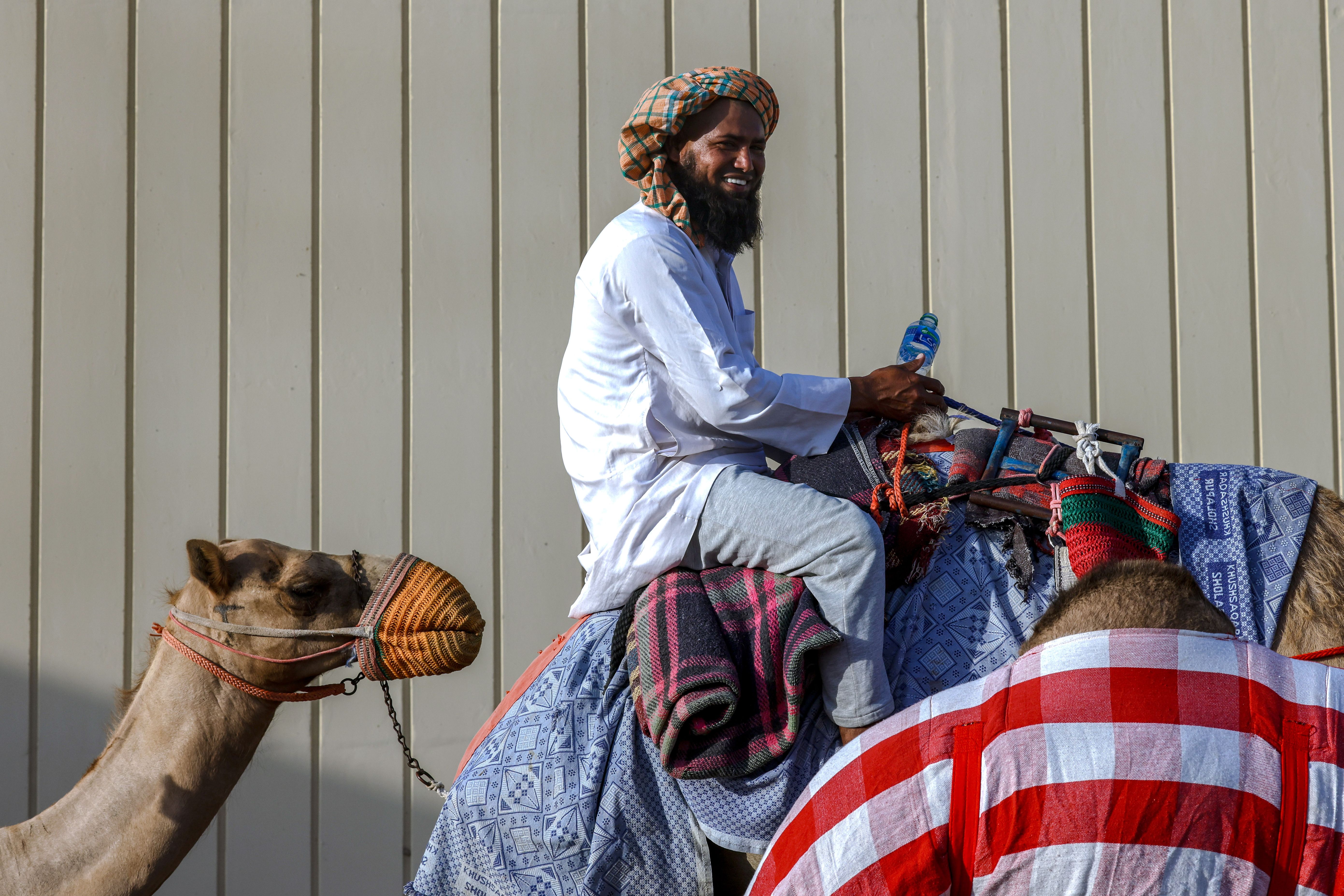 Camel herders take a shortcut with their caravan of camels back to the farm on a dirt road under a highway at Al Wathba area in Abu Dhabi on June 10, 2025. (Photo by Victor Besa/The National)