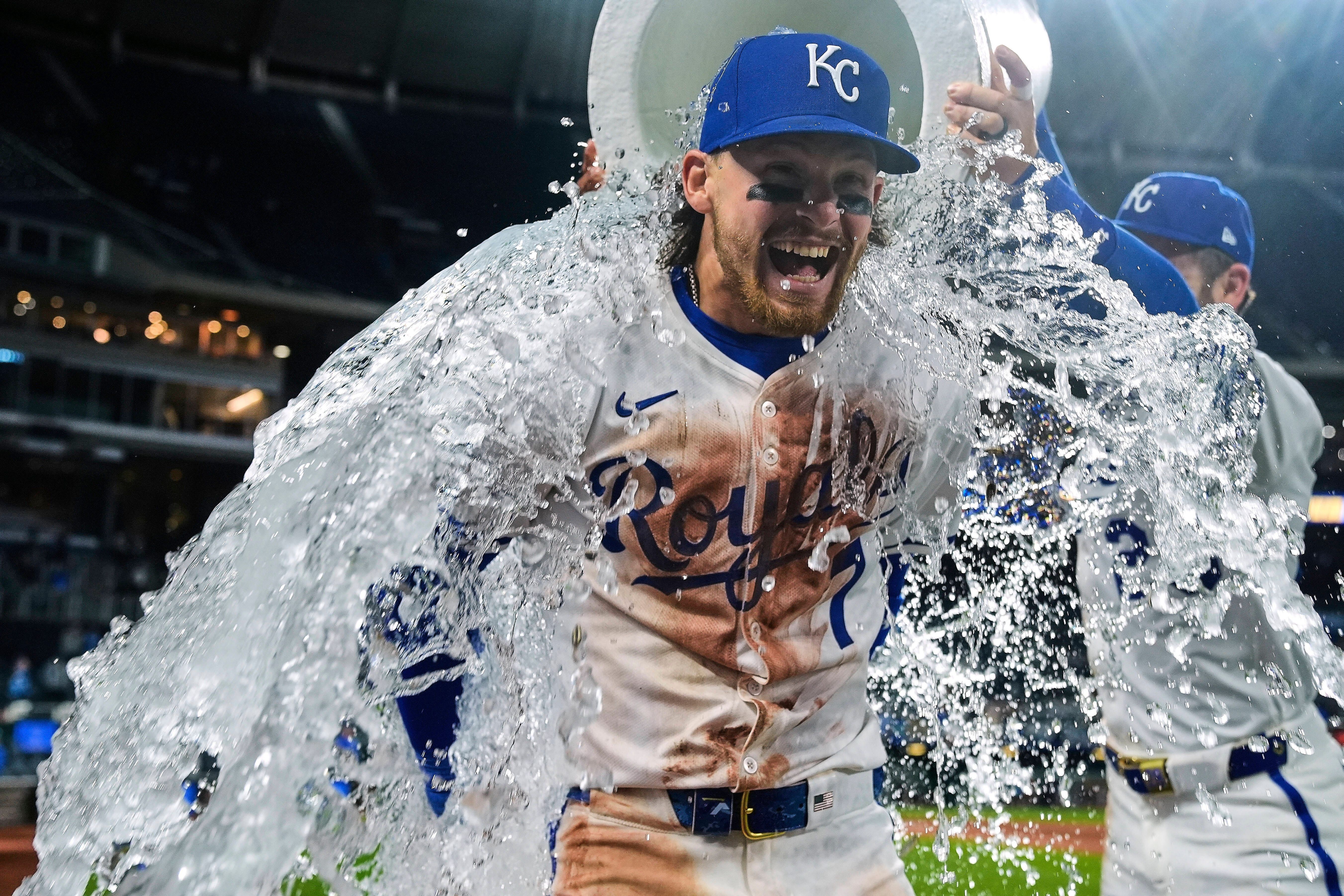 Kansas City Royals' Bobby Witt Jr. is doused by teammates after a baseball game against the Minnesota Twins, Tuesday, April 8, 2025, in Kansas City, Mo. (Photo by Charlie Riedel/AP Photo)