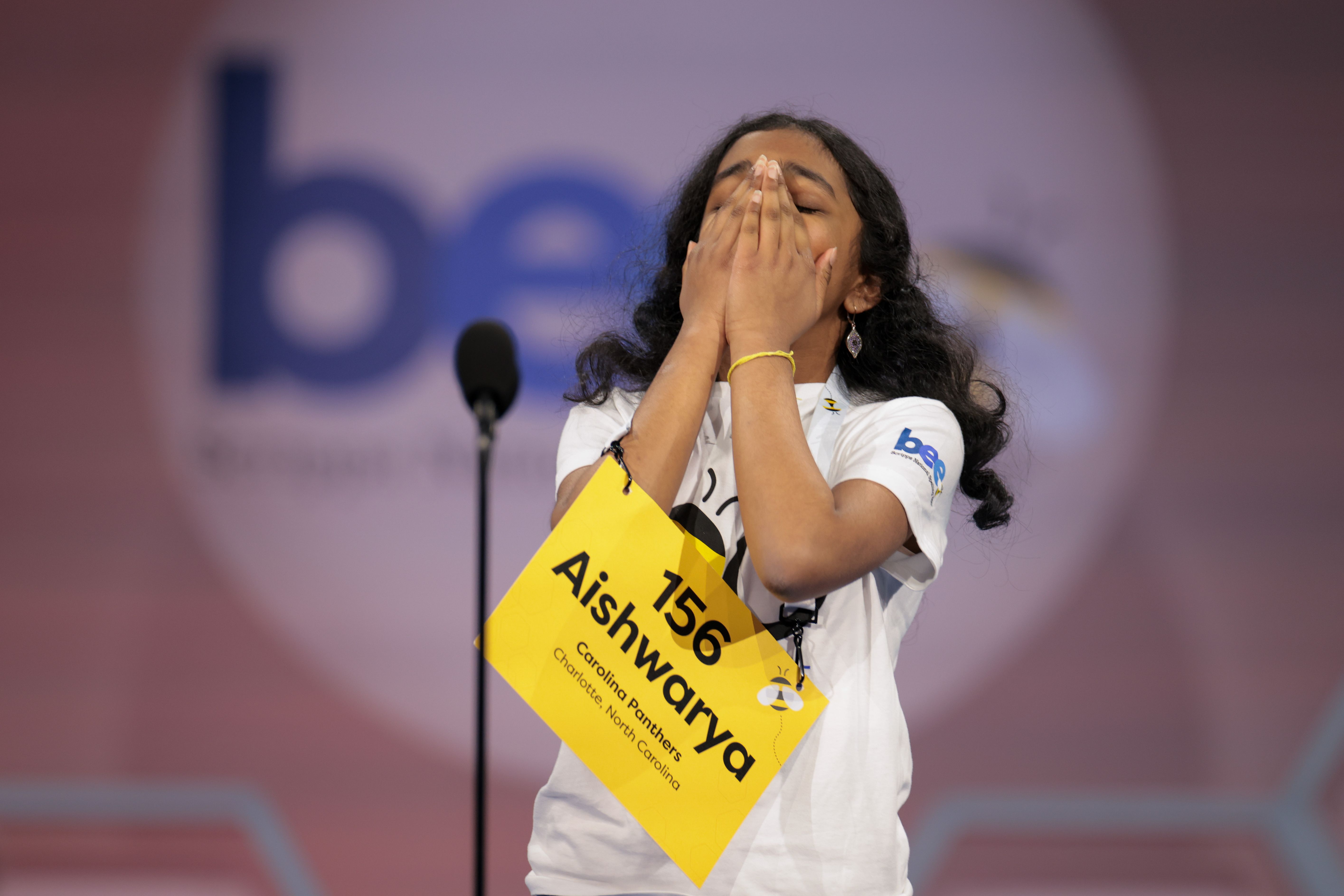 Aishwarya Kallakuri, 14, of Charlotte, North Carolina reacts after correctly spelling her word in the semifinals of the 2025 Scripps National Spelling Bee at the Gaylord National Resort and Convention Center on May 28, 2025 in National Harbor, Maryland. 243 spellers from all over the globe ages 8 to 14 compete from May 27 to May 30, 2025 during the 100th anniversary of the bee. (Photo by Kayla Bartkowski/Getty Images)
