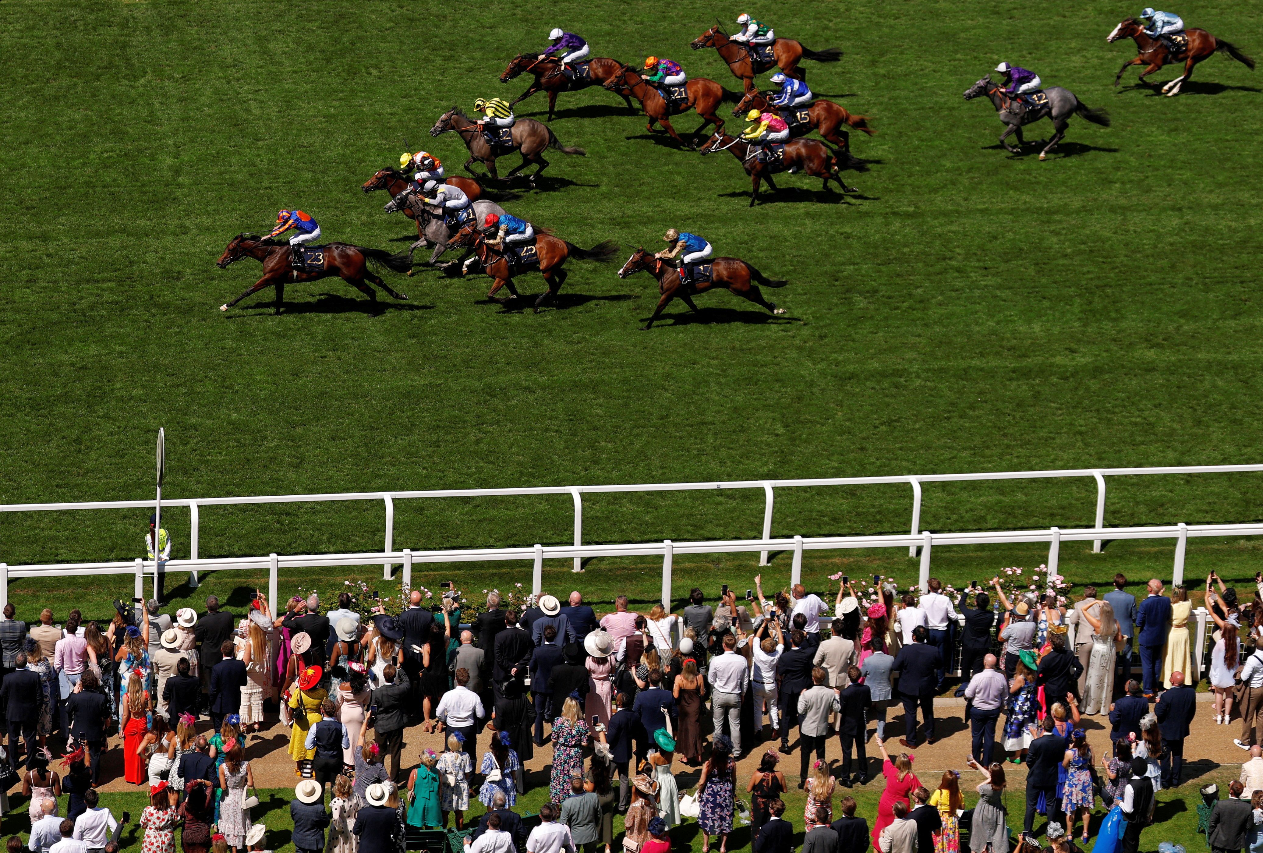General view of jockeys and their horses in action during the Queen Mary Stakes during the Royal Ascot in Ascot, Britain on June 18, 2025. Photo by Andrew Couldridge/Action Images via Reuters)