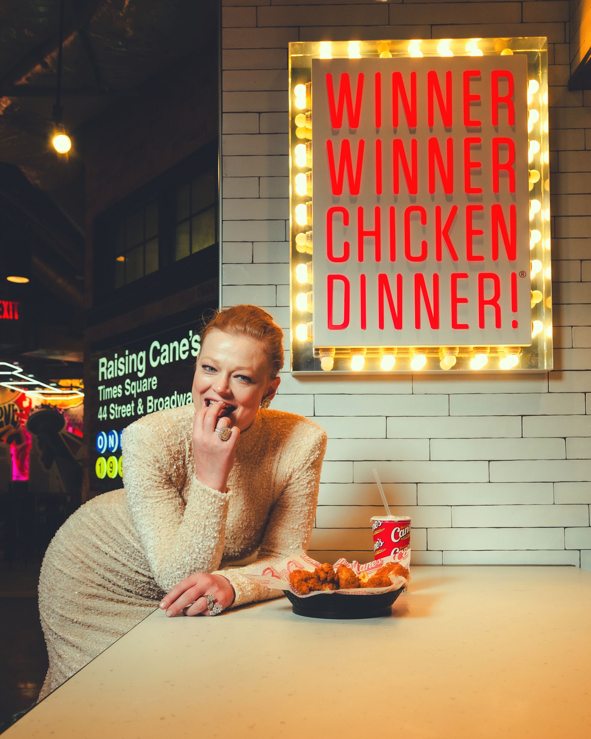 Australian actress Sarah Snook in the first decade of June 2025 enjoys a meal at Raising Cane’s Times Square Flagship Restaurant on Broadway in NYC after winning her first-ever Tony Award for best performance by lead actress in a play. (Photo by Raising Cane's)