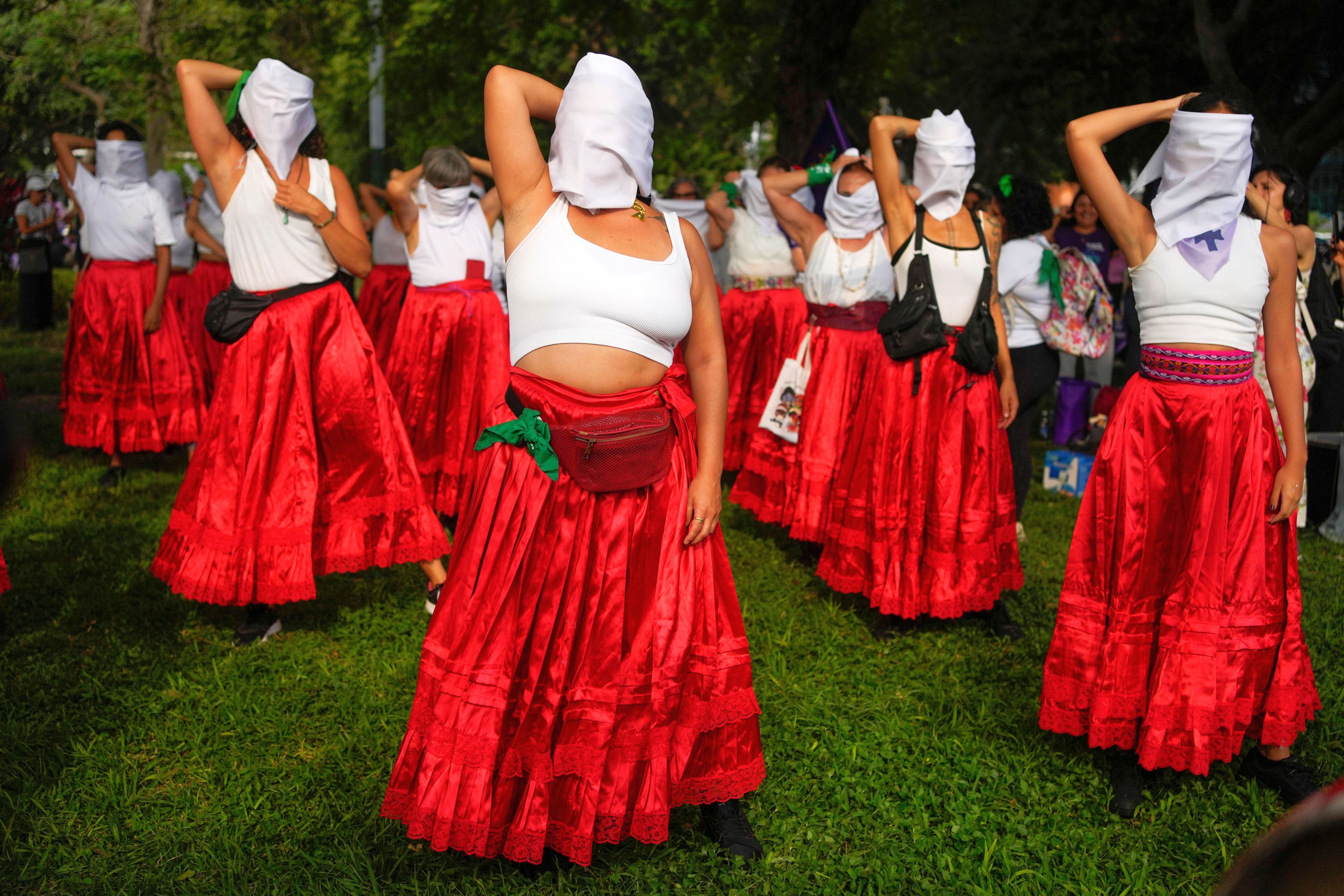 Women perform covering their faces with white scarves to symbolize that women are invisible in the justice system during an International Women's Day event in Lima, Peru, March 8, 2024. (Photo by Martin Mejia/AP Photo)