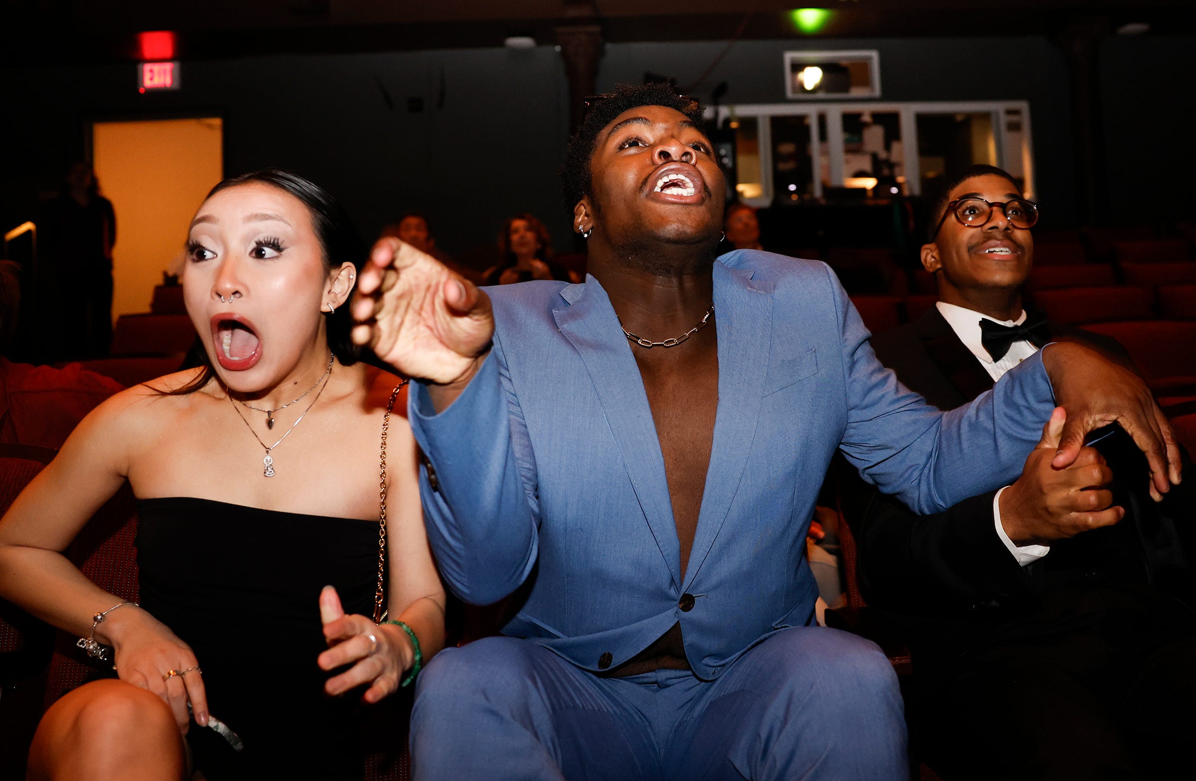 Temple Musical Theater students, from left, Hannah Nguyen, Zachary Boufford and Jeremy Mitchell react after Temple alumni Da'Vine Joy Randolph won the Oscar for Best Supporting Actress for her role in the “The Holdovers” at the Temple Performing Arts Center on Sunday, March 10, 2024. (Photo by Yong Kim/AP Photo)