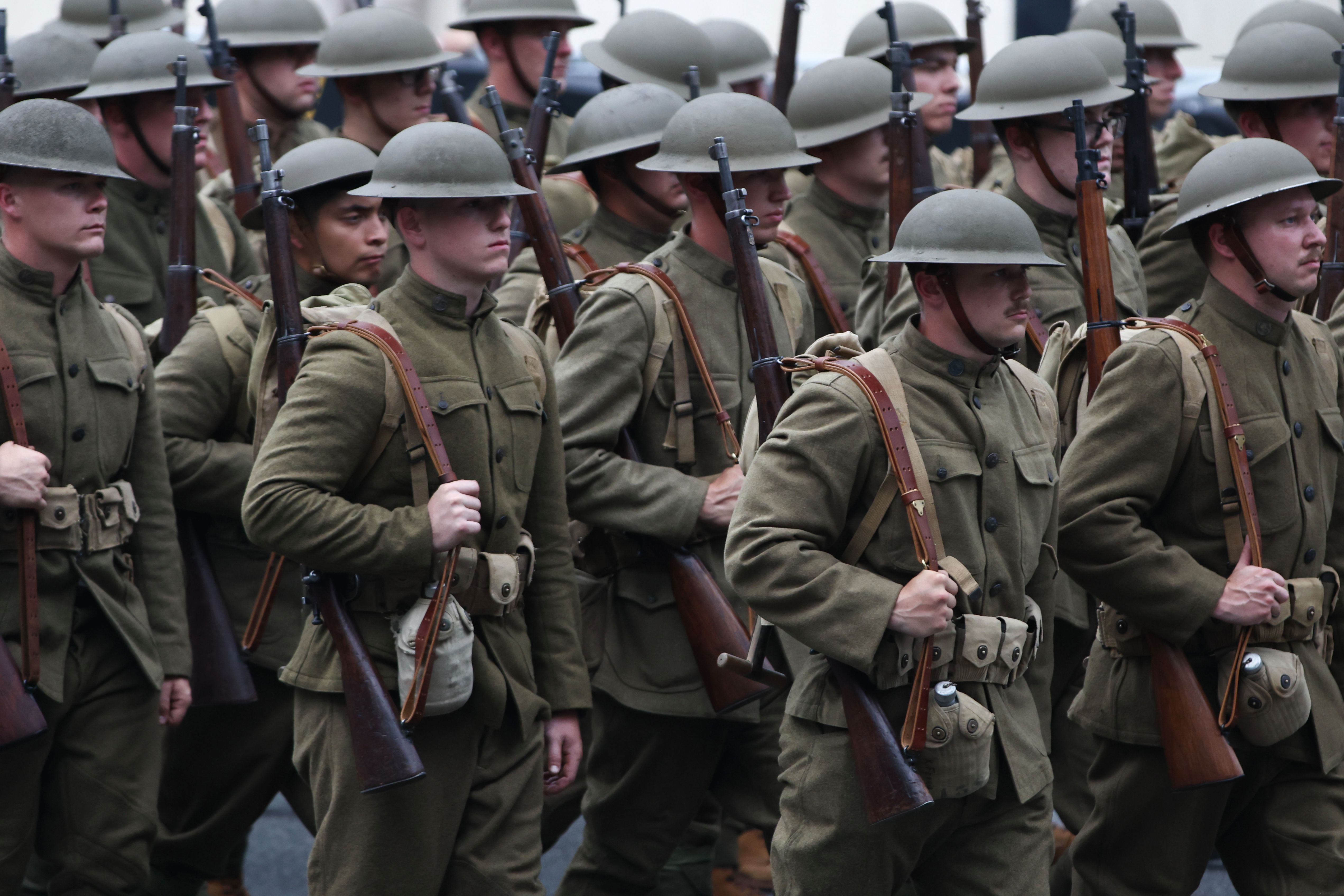 Soldiers dressed in World War I uniforms march in the military parade on June 14, 2025 in Washington, DC. The U.S. Army is marking its 250th anniversary with a military parade along Constitution Avenue that includes roughly 6,600 troops, 150 vehicles, and over 50 aircraft. The parade, which coincides with President Donald Trump's 79th birthday, is designed to tell the history of the Army. (Photo by Samuel Corum/Getty Images)
