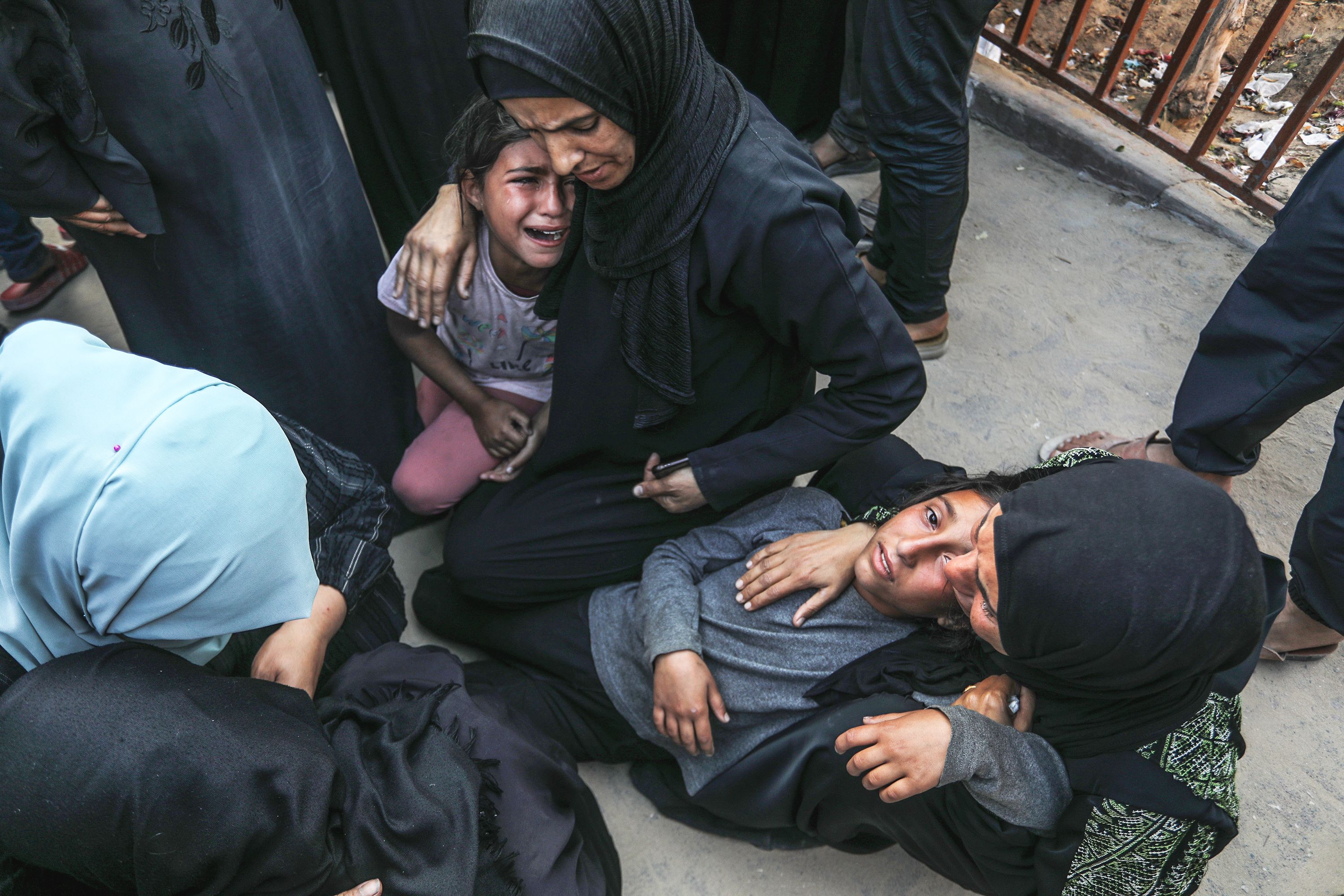 Relatives and loved ones of Palestinians, who lost their lives in Israeli attacks, mourn for their deceased ones at Nasser Hospital as funeral procedures are underway in Khan Yunis, Gaza on May 21, 2025. (Photo by Abed Rahim Khatib/Anadolu via Getty Images)