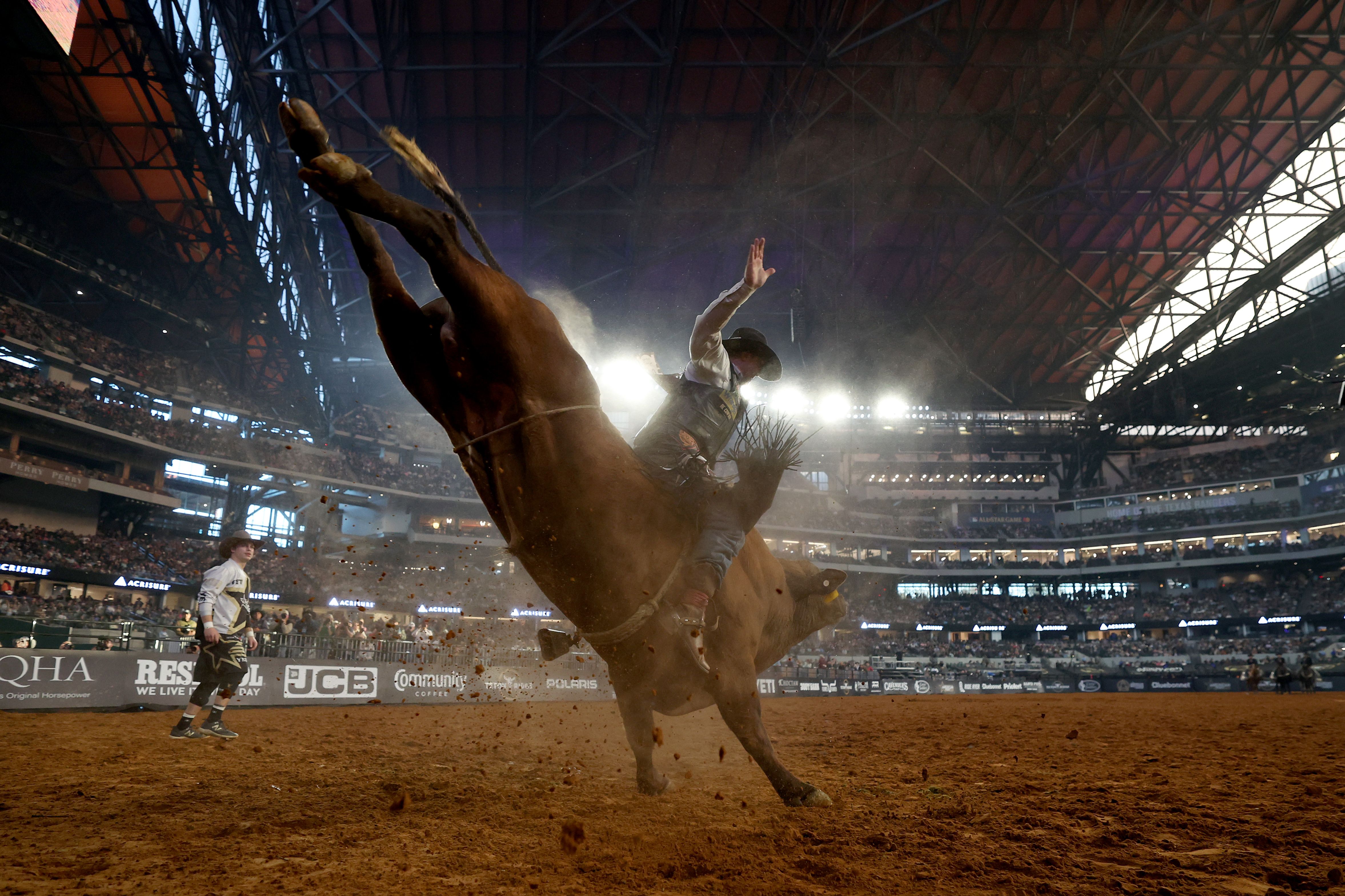Cody Nance, riding Wing Man, competes in the bull riding event during The American Rodeo by Teton Ridge at Globe Life Field on March 09, 2024 in Arlington, Texas. (Photo by Al Bello/Getty Images for Teton Ridge)
