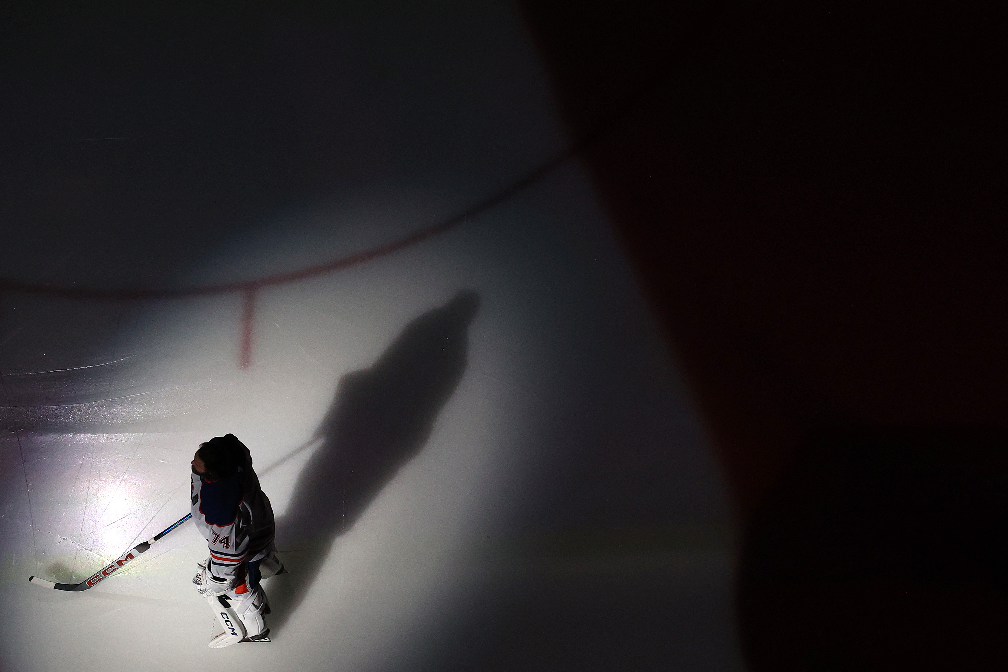 Stuart Skinner #74 of the Edmonton Oilers listens to the national anthem against the Florida Panthers in Game Four of the 2025 Stanley Cup Final at Amerant Bank Arena on June 12, 2025 in Sunrise, Florida. (Photo by Steph Chambers/Getty Images/AFP Photo)