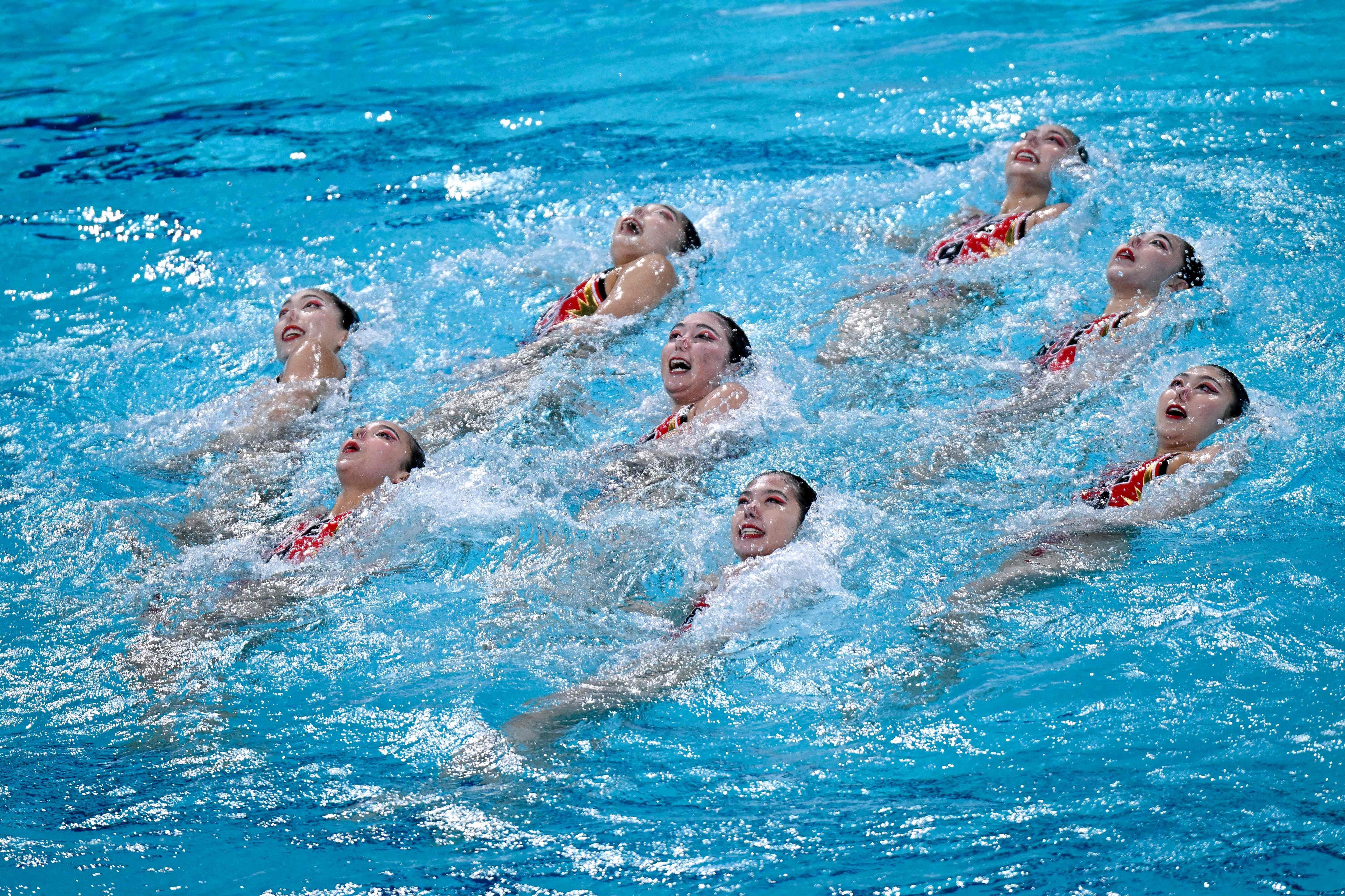 Team Japan competes in the team technical of the artistic swimming event during the 2025 World Aquatics Artistic Swimming World Cup Super Final in Xi'an, in China’s Shaanxi province, on June 13, 2025. (Photo by Wang Zhao/AFP Photo)