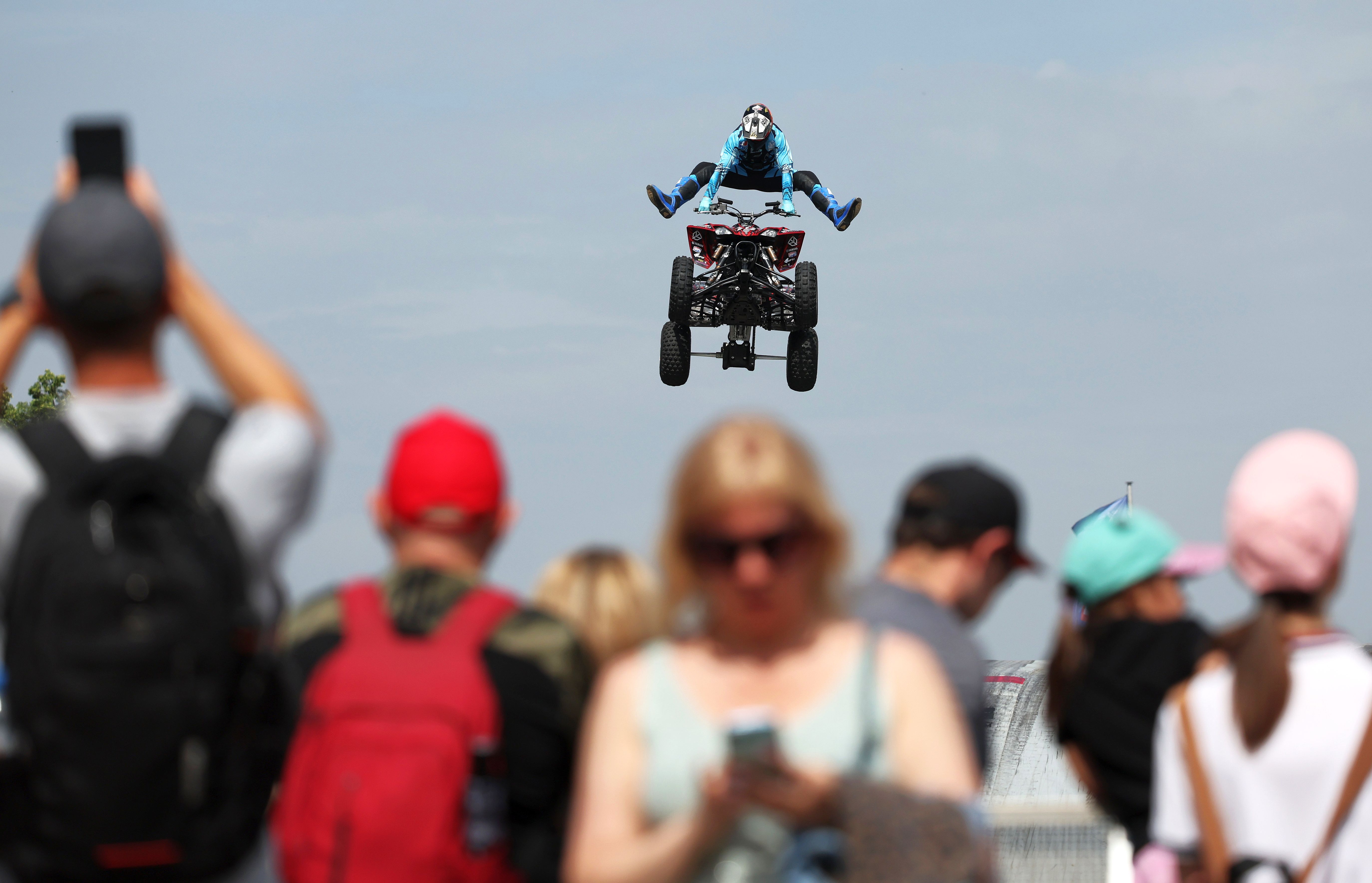A motorcyclist performs during the Day of Moscow Sports Festival in Moscow, Russia, 31 May 2025. The festival, organized by Moscow authorities, aims to promote a healthy lifestyle. (Photo by Maxim Shipenkov/EPA/EFE)