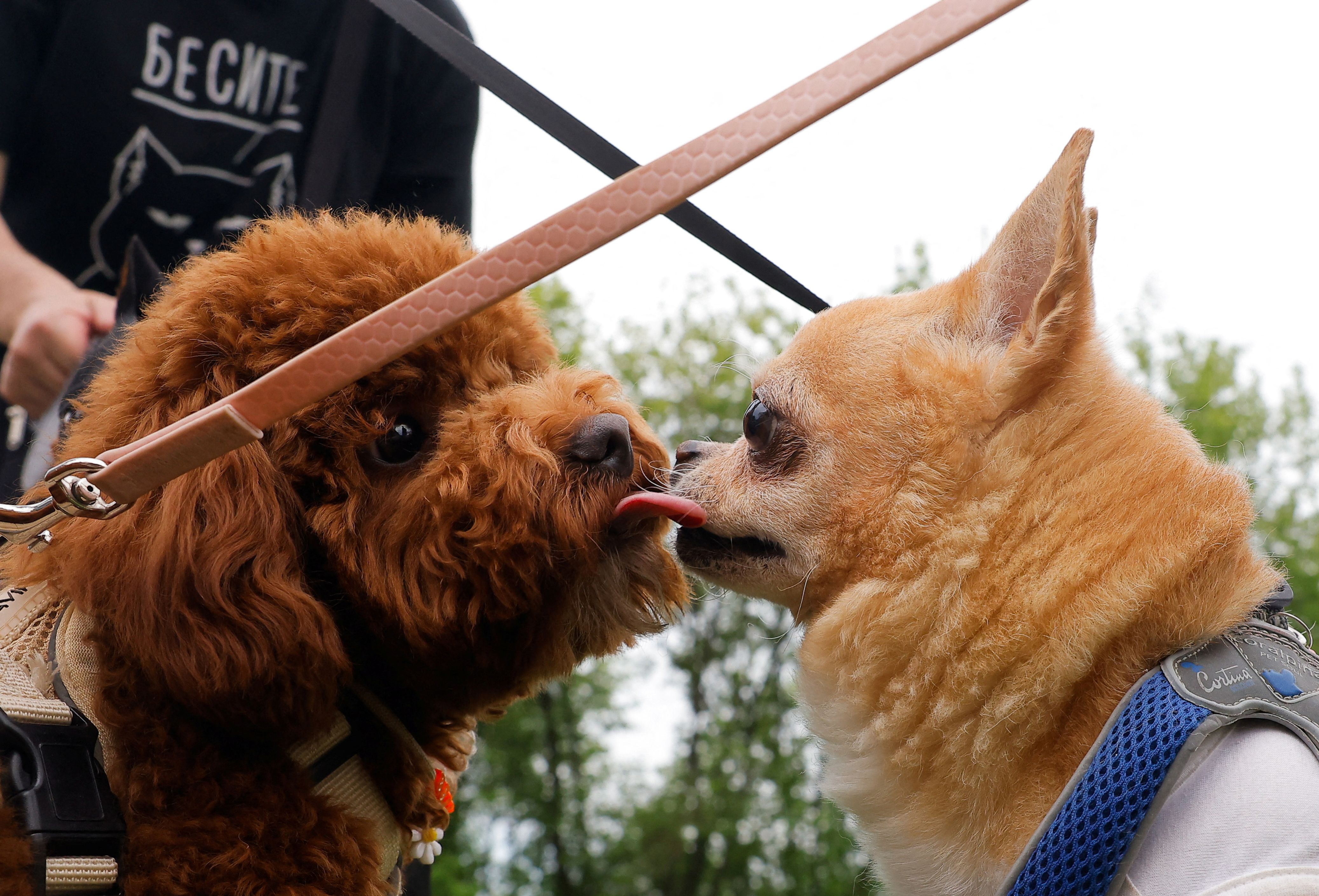 Toy Poodle and Chihuahua dogs are seen during Russian Cynological Federation championship in dog agility in Moscow, Russia, on May 31, 2025. (Photo by Maxim Shemetov/Reuters)