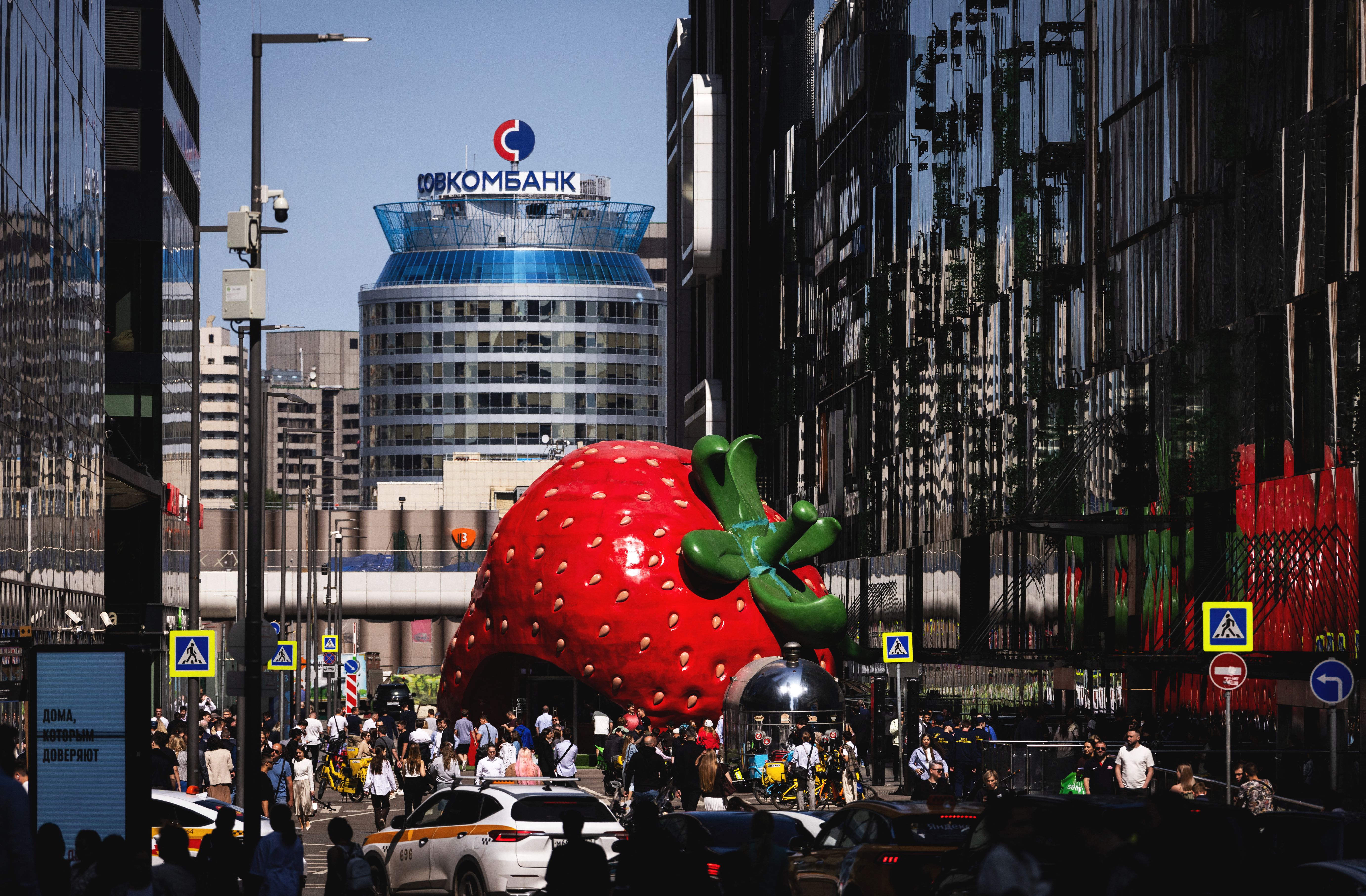 A pavilion in the form of a giant strawberry is seen next to the office of Sovkombank at Moscow International Business Center, also known as Moscow-City, in Moscow, on June 2, 2025. (Photo by Maxim Shemetov/Reuters)