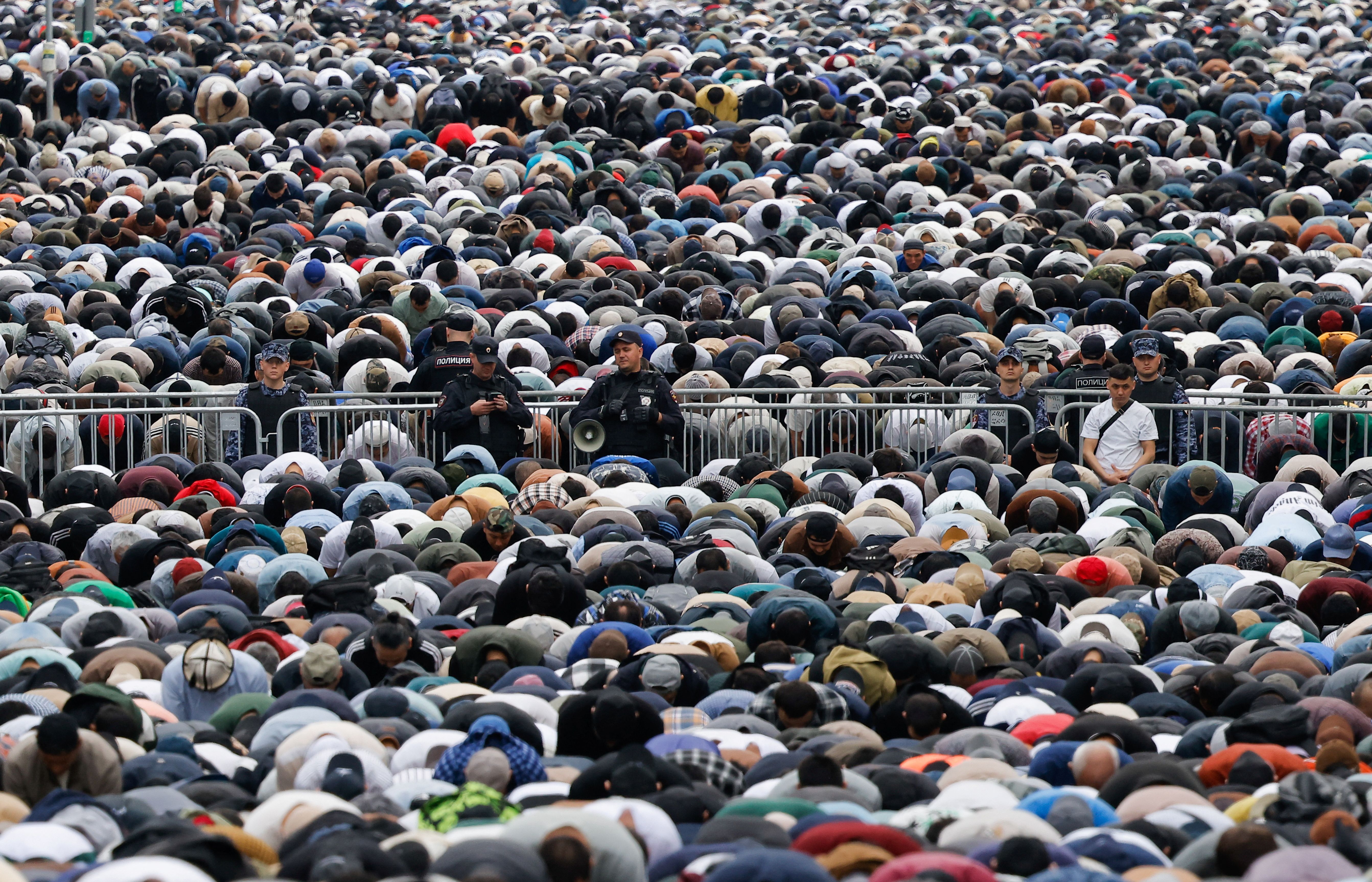 Law enforcement officers stand guard as muslims attend Eid al-Adha mass prayer, marking the end of the hajj pilgrimage near Moscow's grand mosque in Russia, on June 6, 2025. (Photo by Maxim Shemetov/Reuters)