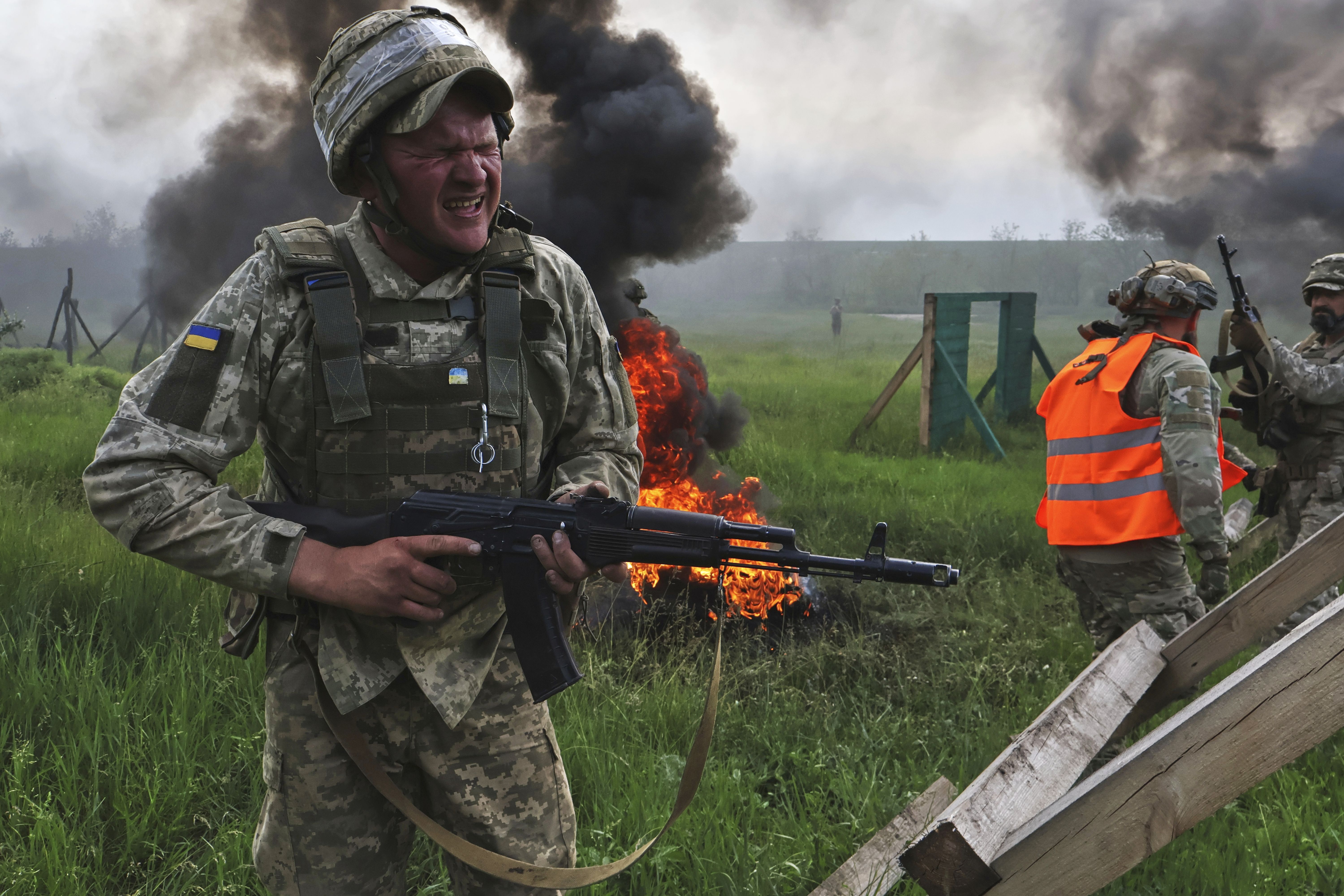 In this photo provided by Ukraine's 65th Mechanized Brigade press service, Ukrainian servicemen attend a military training in Zaporizhzhia region, Ukraine, Monday, May 26, 2025. (Photo by Andriy Andriyenko/Ukraine's 65th Mechanized Brigade via AP Photo)