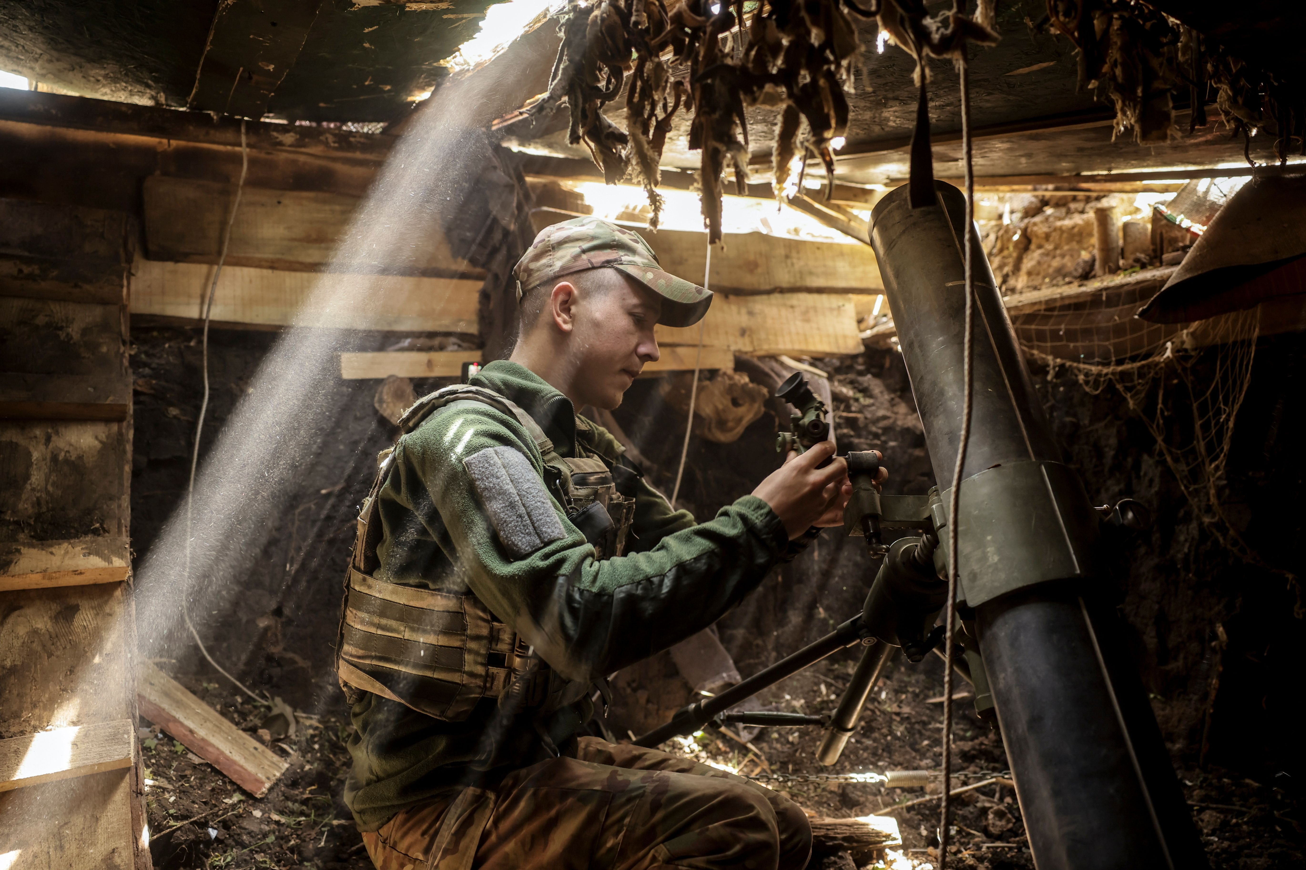 A handout photo made available by the press service of the 24th Mechanized Brigade of Ukrainian Armed Forces, shows a serviceman from the 2nd Rifle Battalion of the 24th Mechanised Brigade named after King Danylo, fires a 120 mm mortar at the outskirts of Chasiv Yar in the Donetsk region , Ukraine, 27 May 2025, amid the ongoing Russian invasion. (Photo by Ukrainian 24th Mechanised Brigade/EPA/EFE)