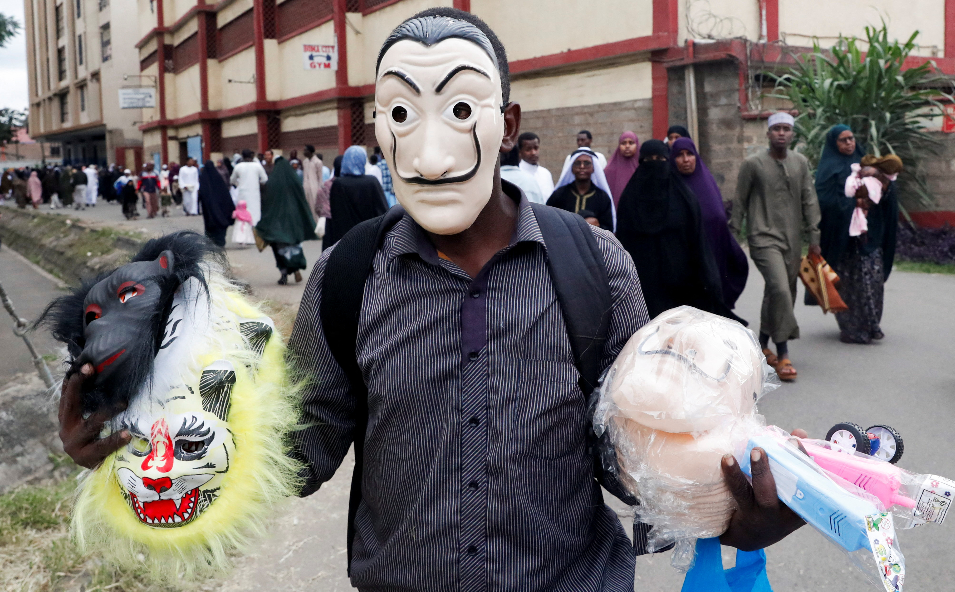 A vendor wears a face mask as he carries others for sale, as Muslims leave after prayers on the first day of the Muslim holiday of Eid al-Adha, outside the Sir Ali Muslim Club Ground in Ngara district of Nairobi, Kenya, on June 6, 2025. (Photo by Monicah Mwangi/Reuters)