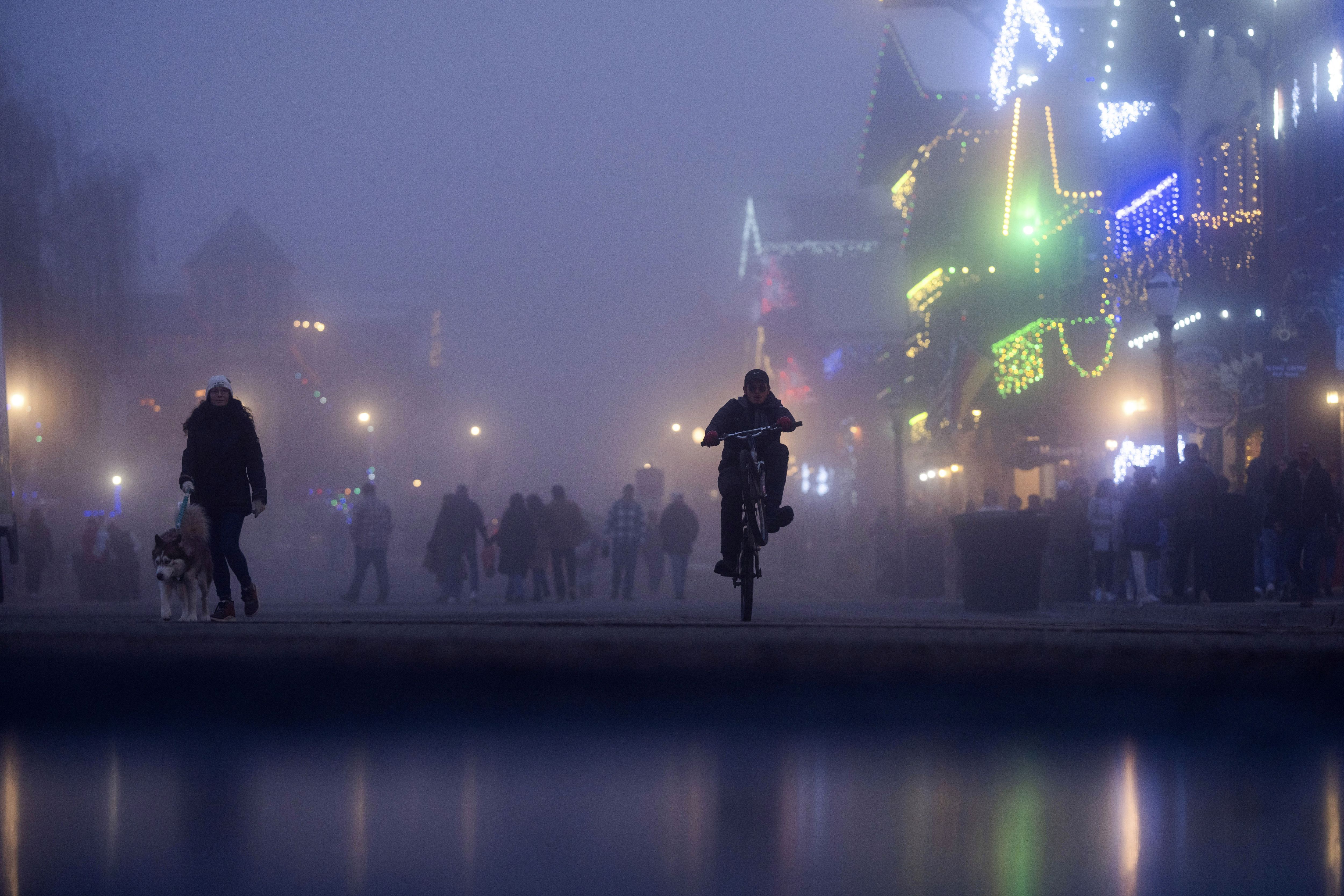 A person pedals a bike past storefronts decorated with Christmas lighting on Front Street, in Leavenworth, Wash., November 26, 2024, (Photo by Jenny Kane/AP Photo)