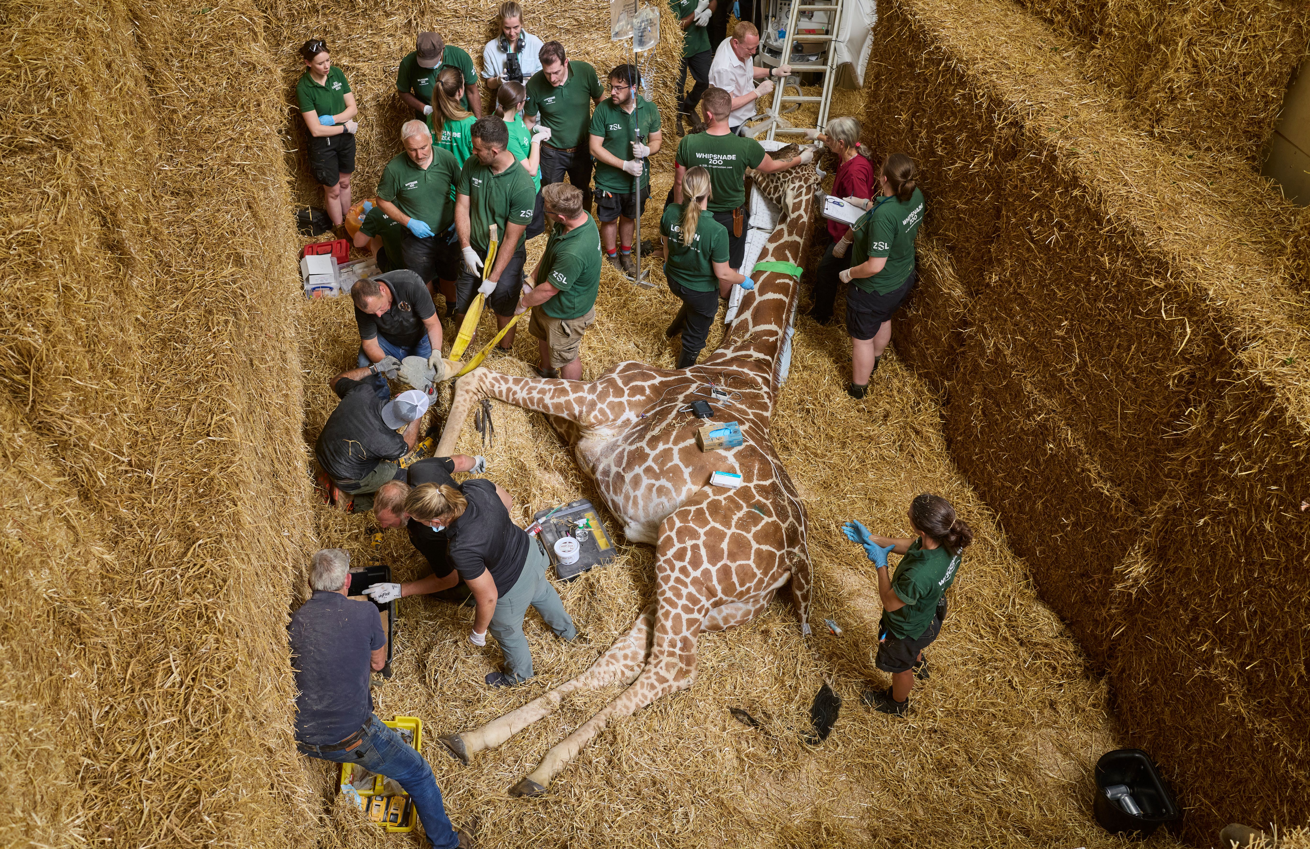 Vets and nurses at ZSL Whipsnade zoo monitor Bashu, a 5-metre (16ft) reticulated giraffe in London, England on June 19, 2025. The animal is under general anaesthetic as specialist farriers perform a radical foot trim on his hooves and fit two custom-made shoes. Bashu will be monitored over the weekend as he recovers. The 13-year-old giraffe, who was being treated for intermittent lameness, could have deteriorated if left untreated and would have been unable to walk. The hay enclosure was created to ensure that Bashu did not injure himself falling over when going under the anaesthetic. (Photo by David Levene/The Guardian)