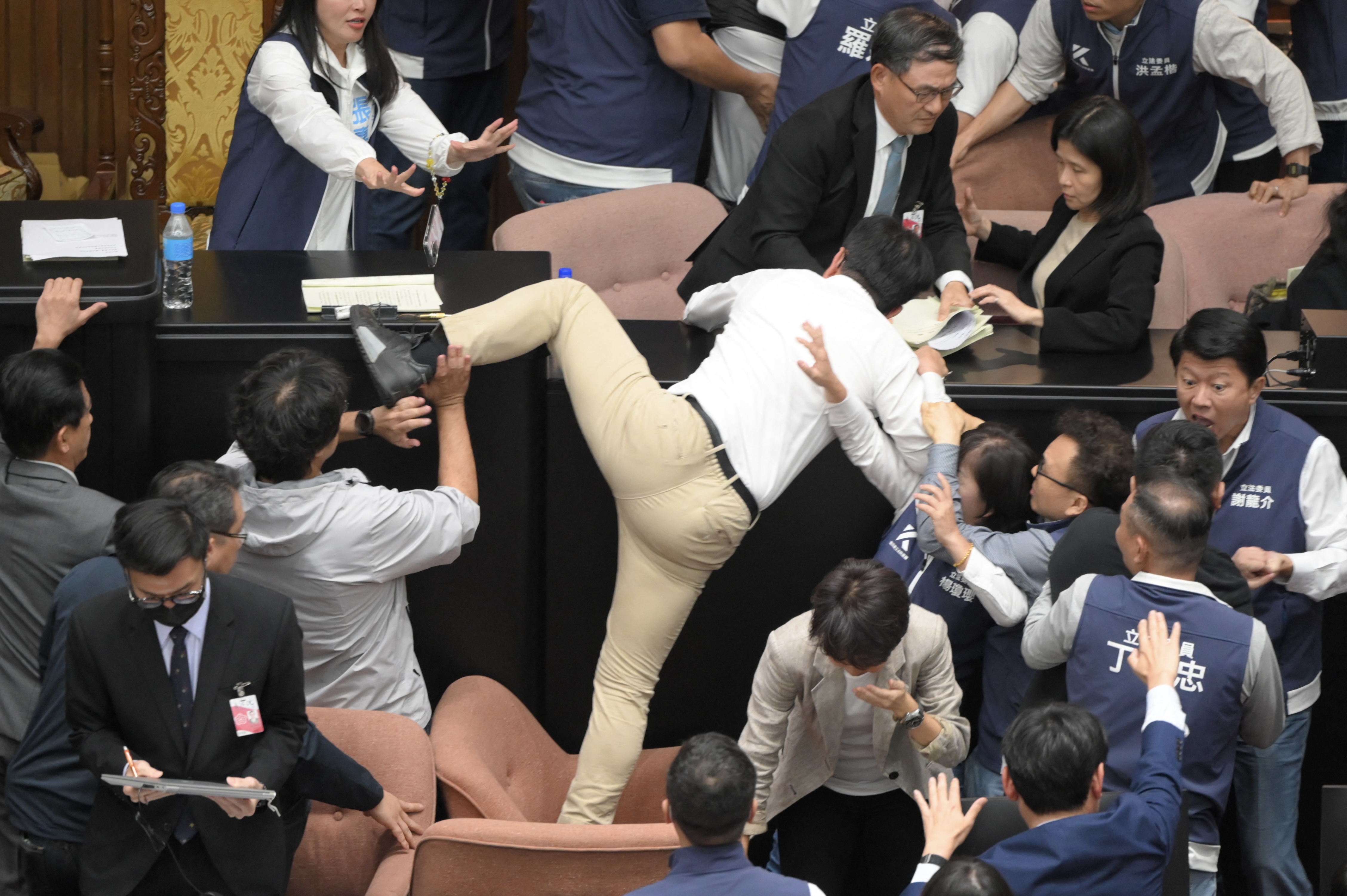 Taiwan's ruling Democratic Progressive Party (DPP) lawmaker Kuo Kuo Wen (C) tries jumping onto the desk during the voting for the Parliament reform bill at Parliament in Taipei on May 17, 2024. (Photo by Sam Yeh/AFP Photo)