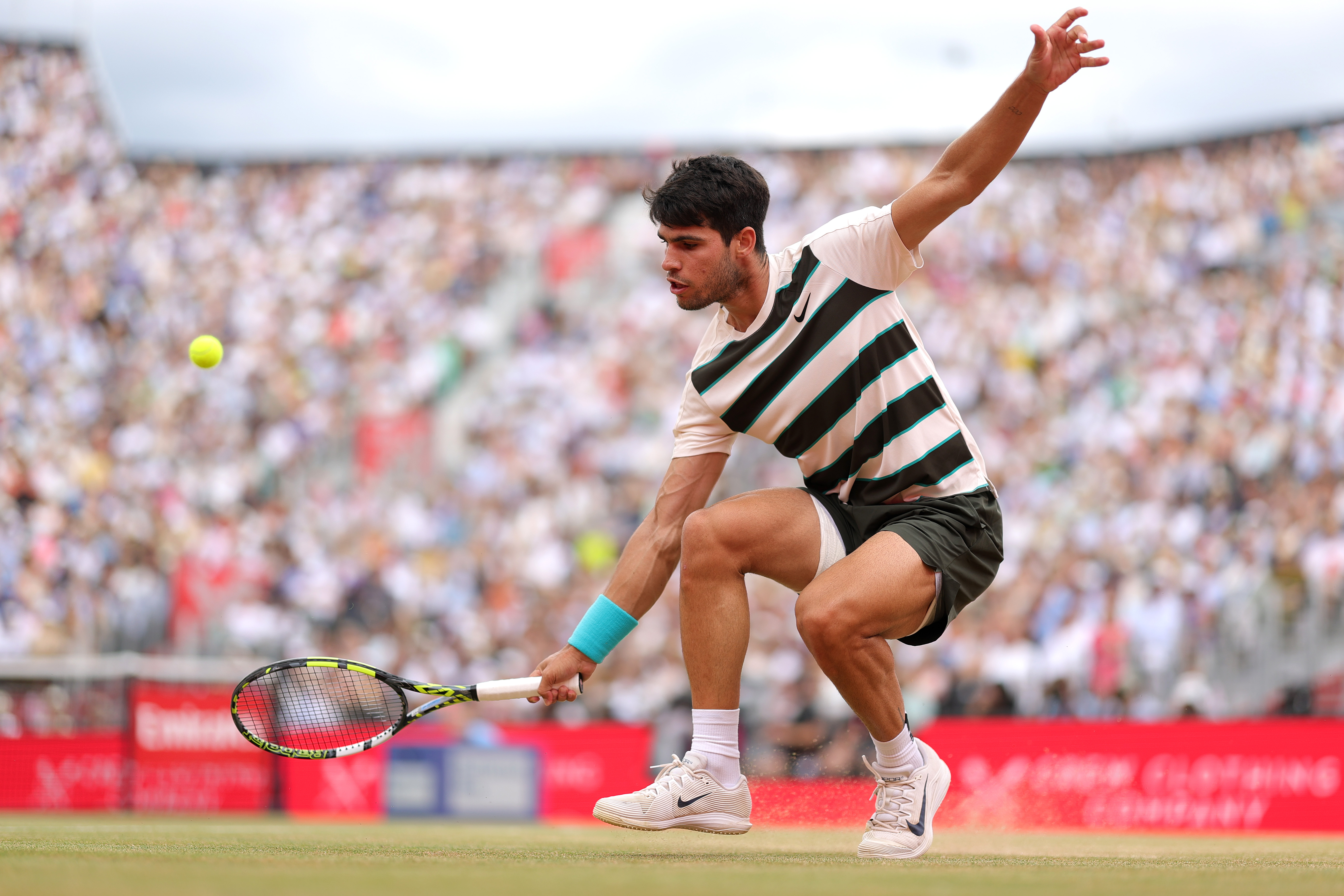 Carlos Alcaraz of Spain plays a backhand against Jiri Lehecka of Czechia during the Men's Singles Final on Day Fourteen of the 2025 HSBC Championships at The Queen's Club on June 22, 2025 in London, England. (Photo by Julian Finney/Getty Images)
