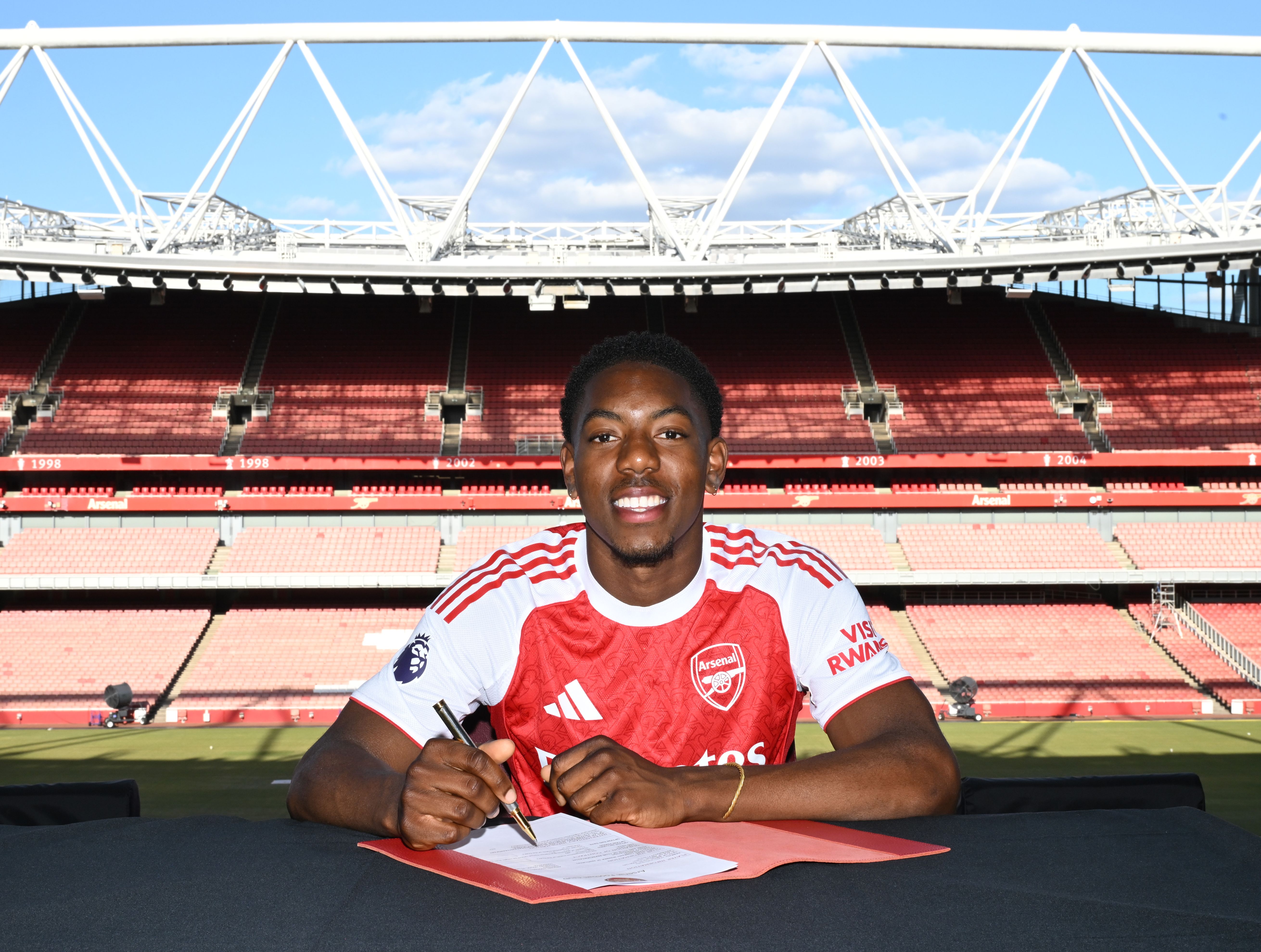 Myles Lewis-Skelly signs a new long term contract for Arsenal FC at Emirates Stadium on June 26, 2025 in London, England. (Photo by Stuart MacFarlane/Arsenal FC via Getty Images)
