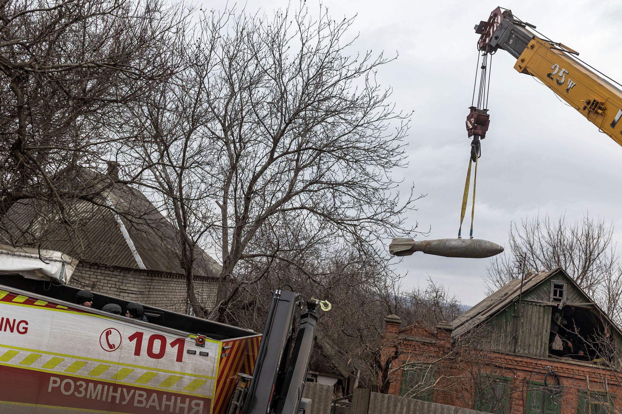 Demining workers crane an unexploded Russian bomb into a demining vehicle at a house, in Kostiantynivka, Ukraine on March 6, 2024. (Photo by Diego Herrera Carcedo/Anadolu via Getty Images)