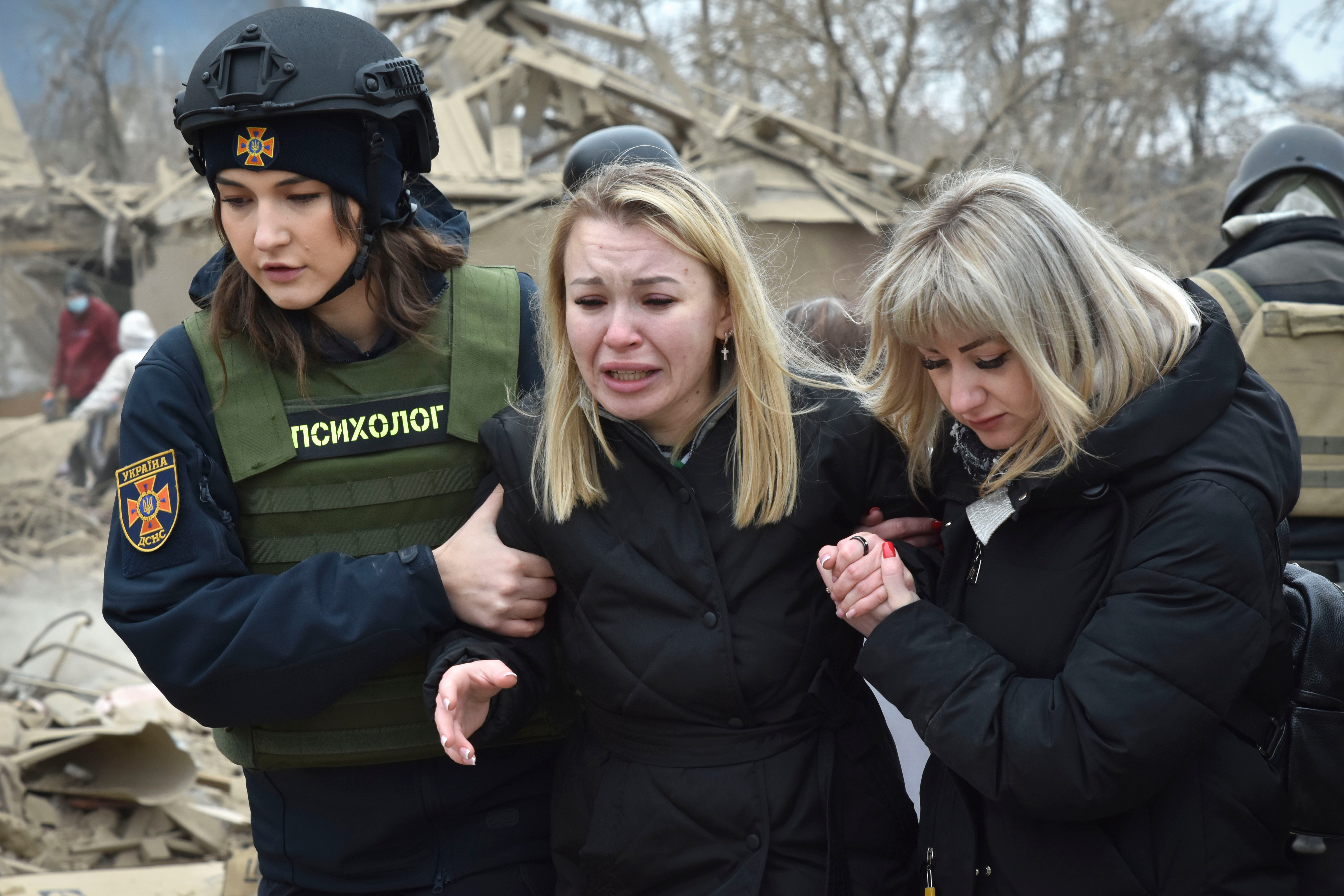 An emergency service psychologist, left, comforts a woman at the site of Russia's air attack, in Zaporizhzhia, Ukraine, Friday, March 22, 2024. (Photo by Andriy Andriyenko/AP Photo)