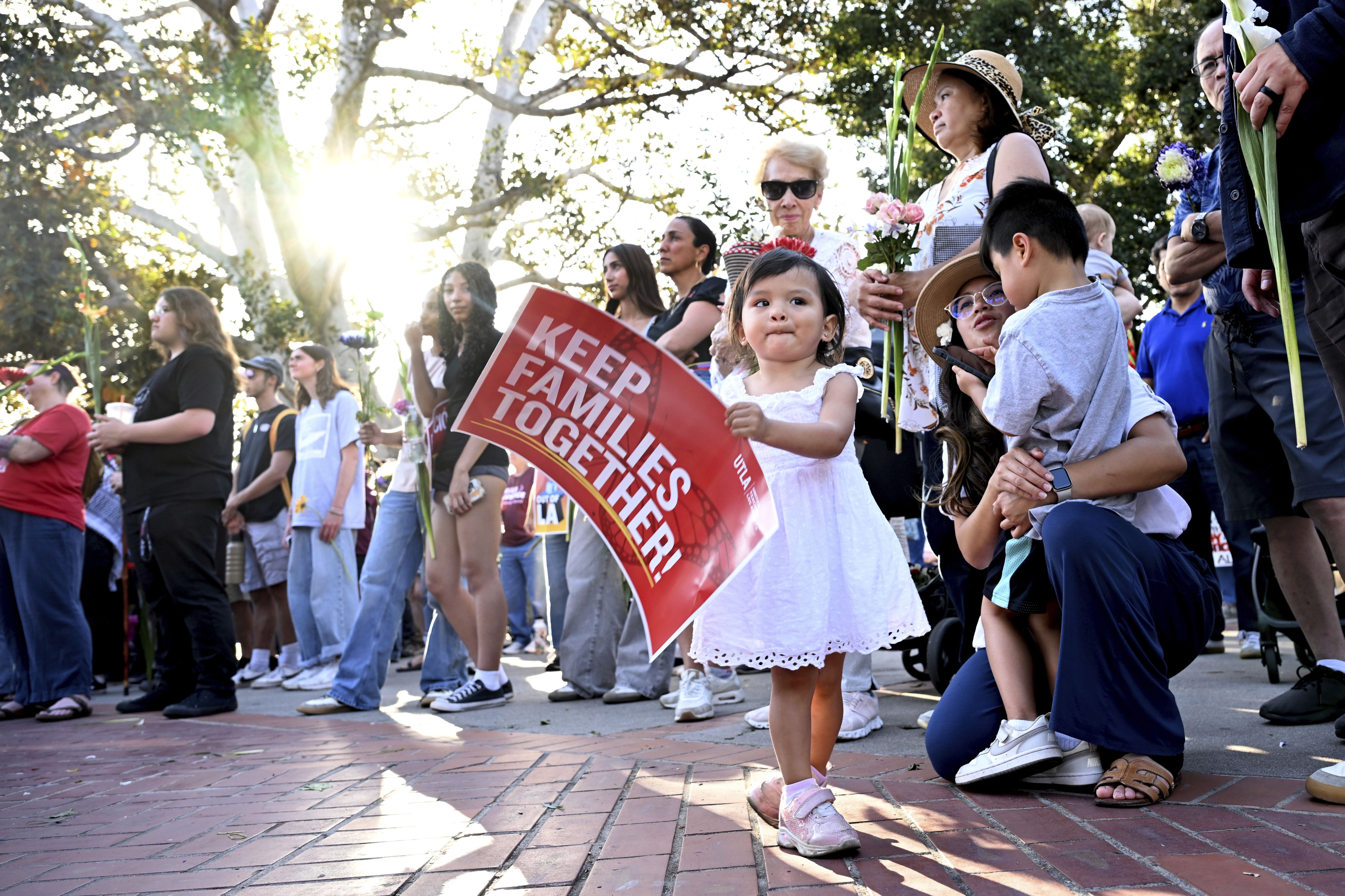 People gather and listen to speeches during a march in solidarity for a peaceful interfaith Prayer Walk for Family Unity Wednesday, June 18, 2025, in Los Angeles. (Photo by Wally Skalij/AP Photo)